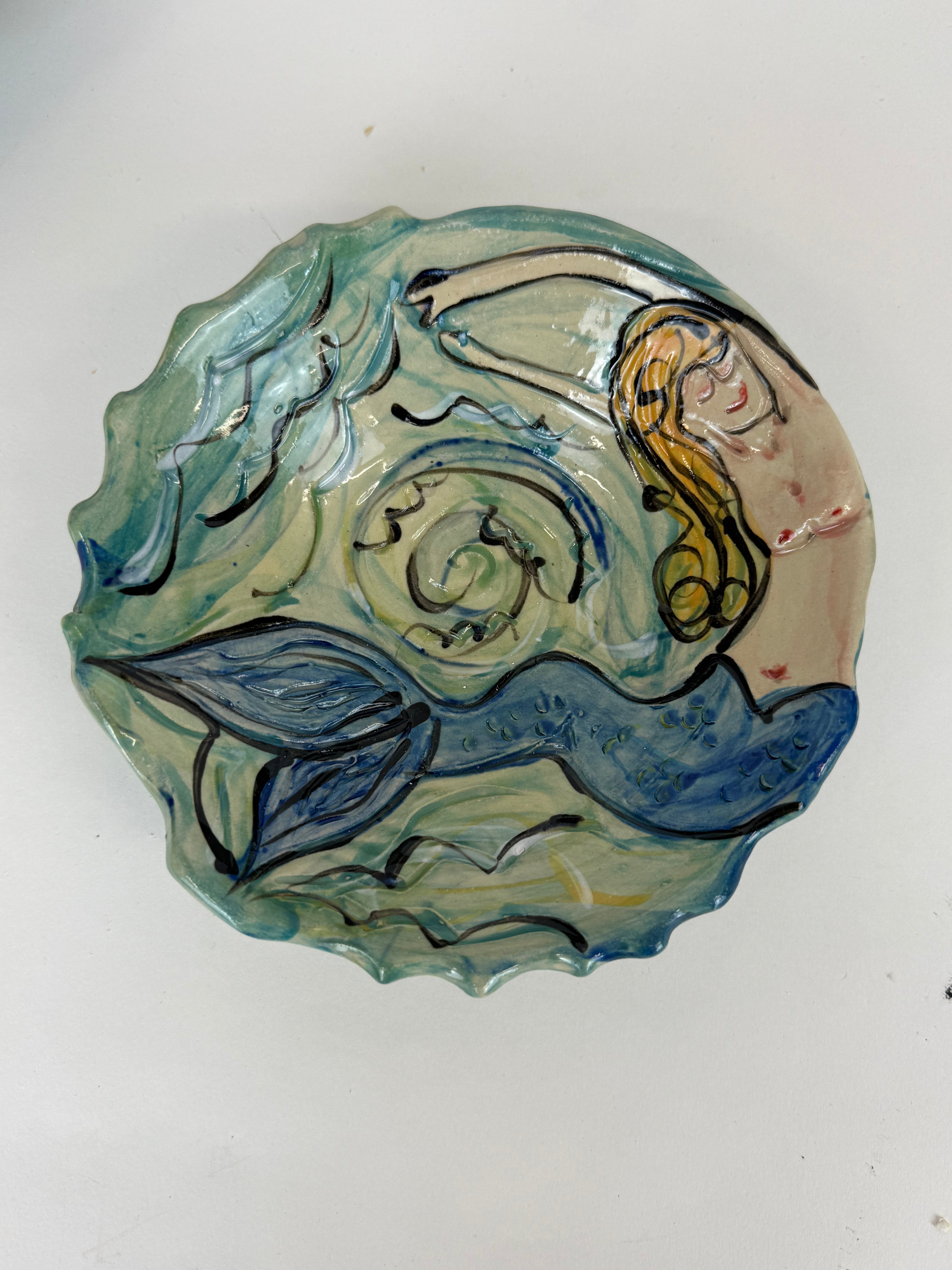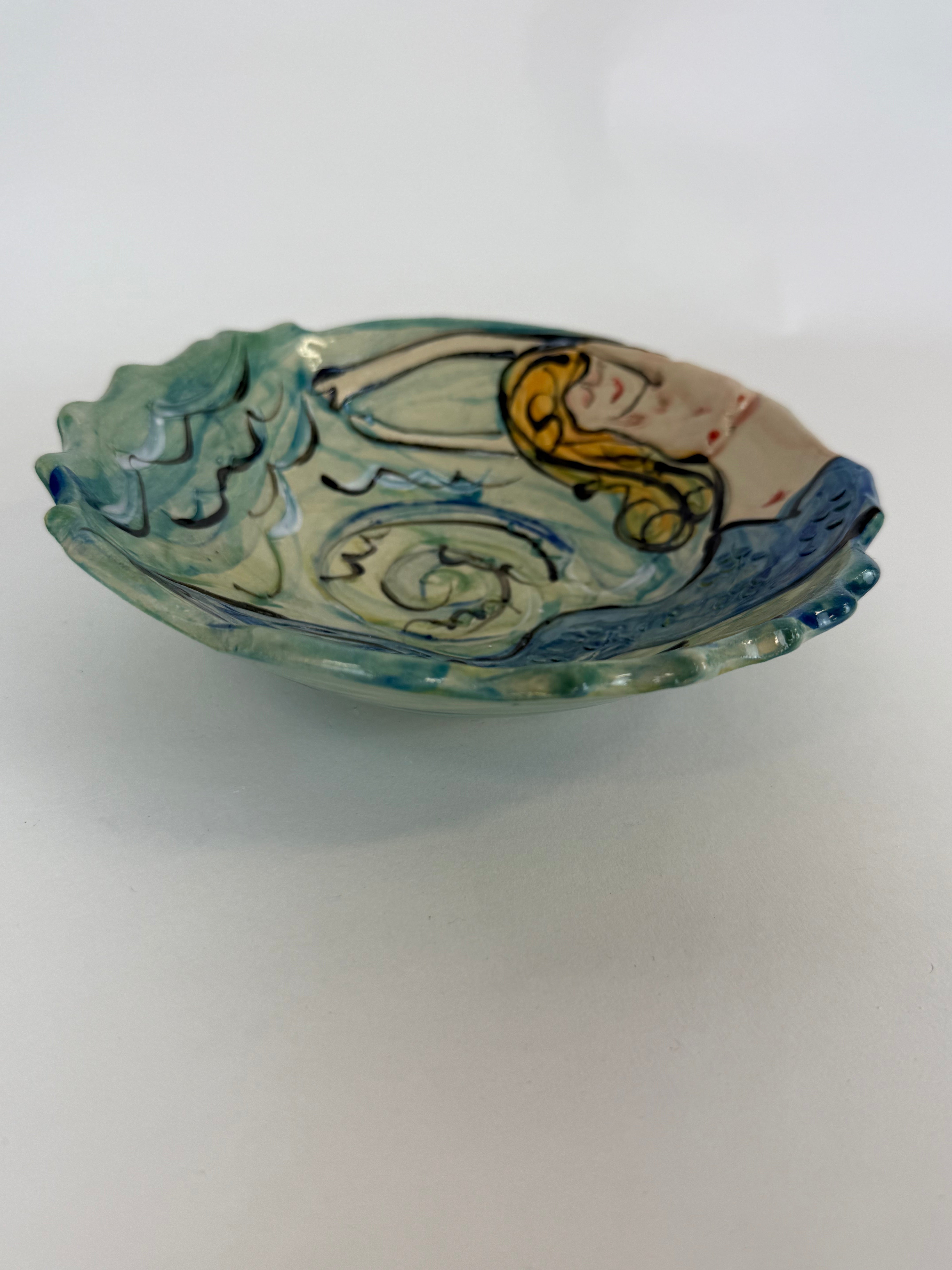 This bowl is thrown on a potter's wheel and then hand carved, handpainted with coloured underglaze colours and adorned with embellishments and finished with a clear glaze.