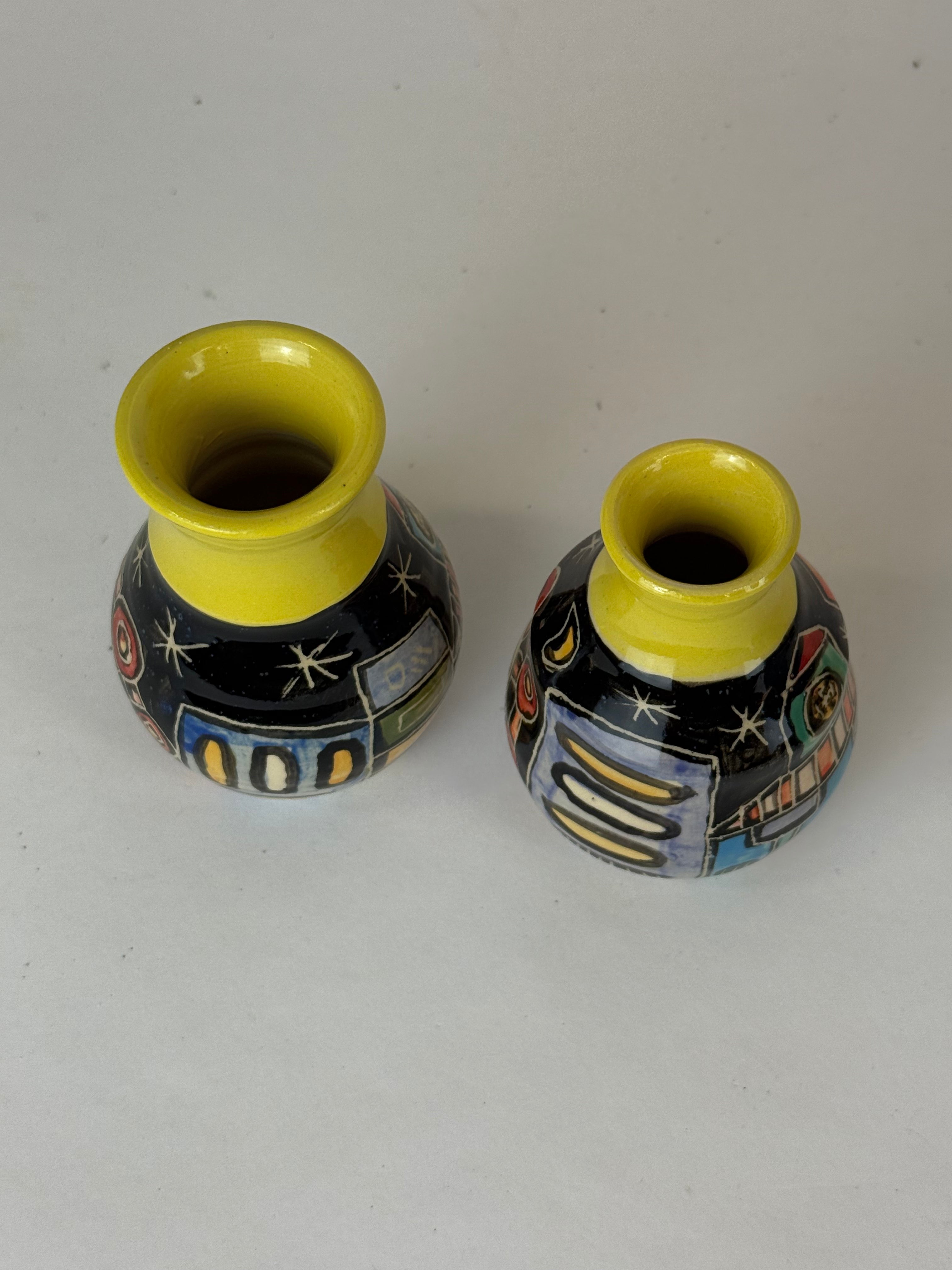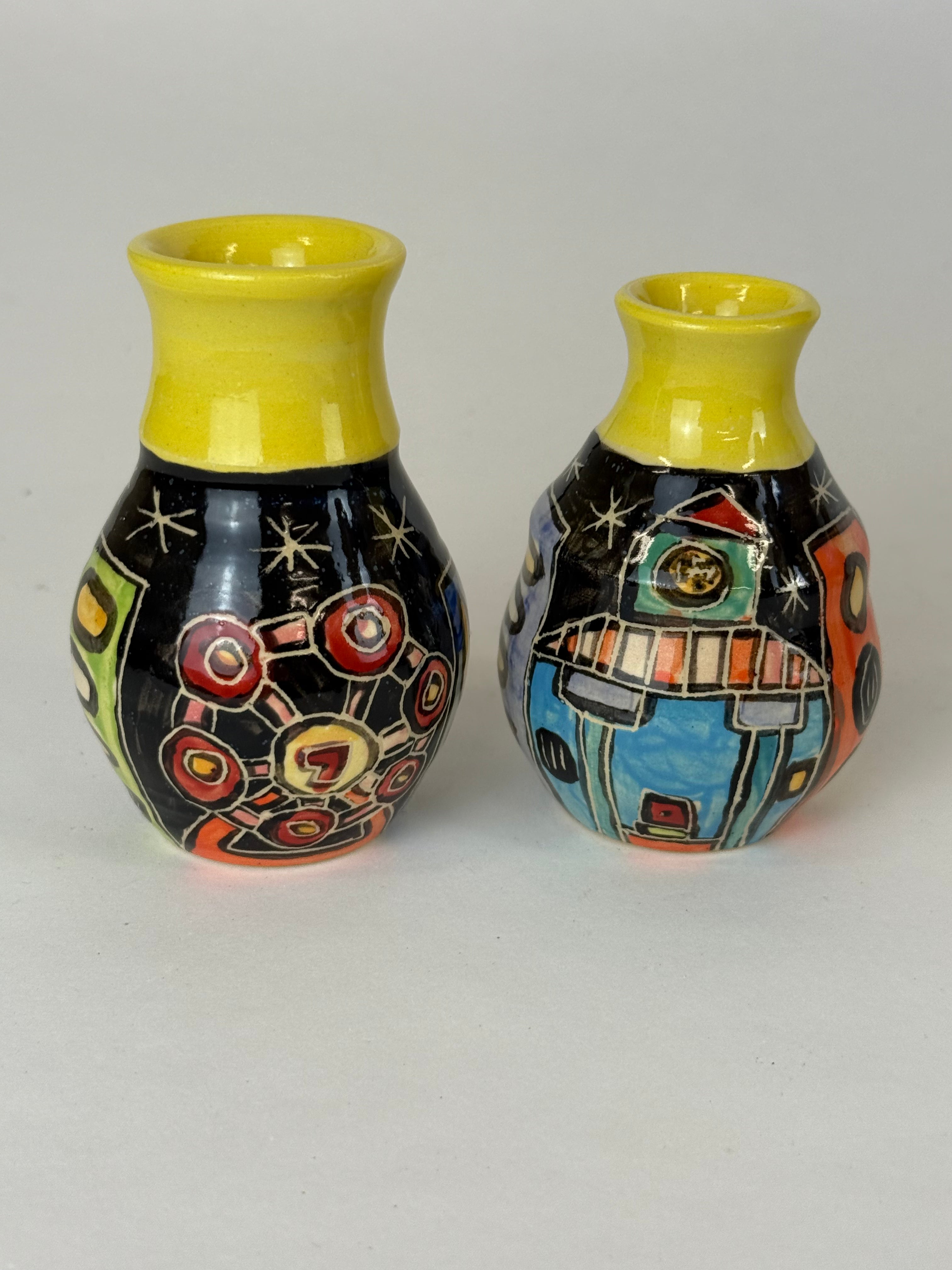 Wheel thrown and decorated in underglaze glazed with a clear glaze.