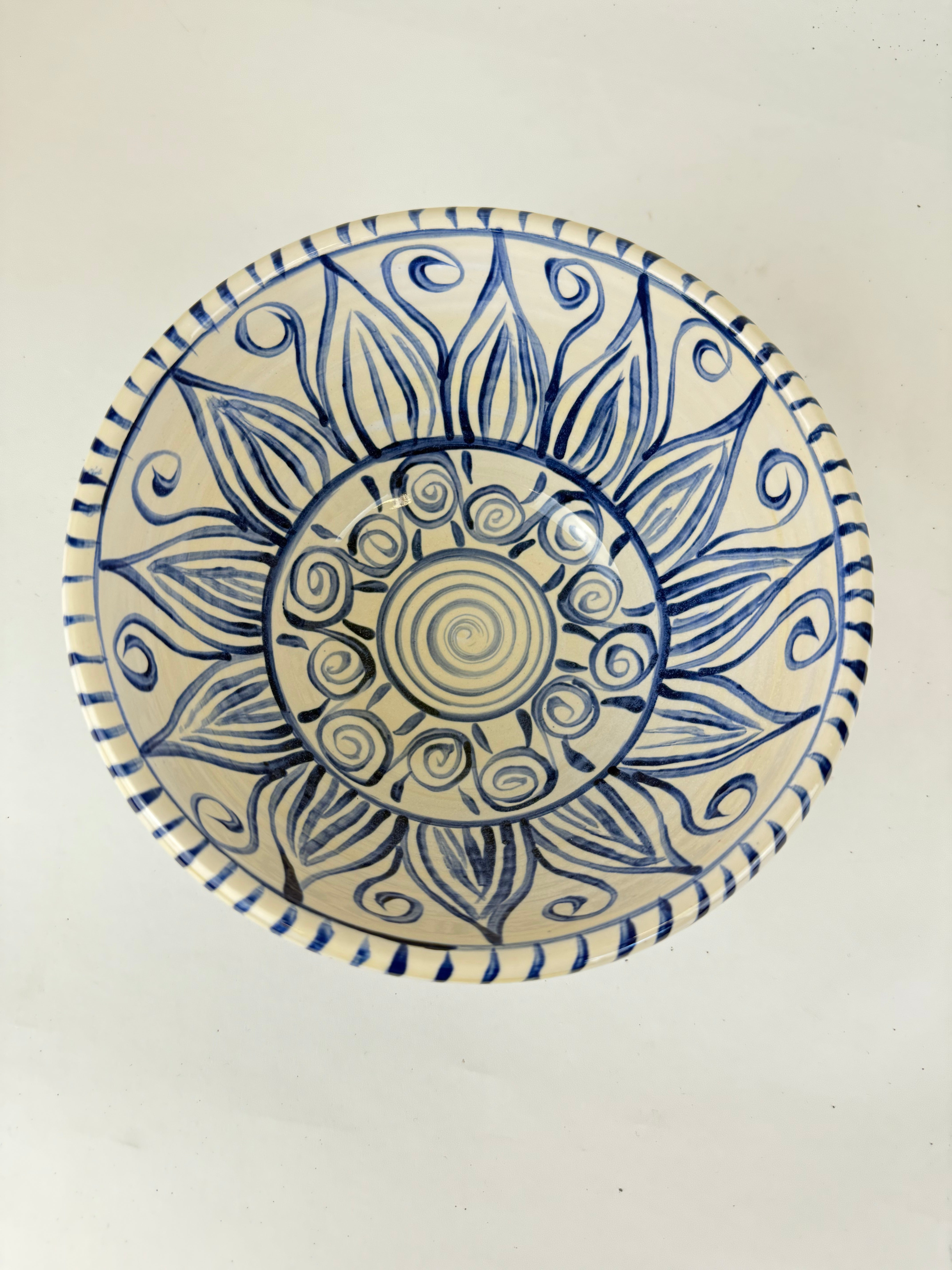 This bowl has been thrown out of SWE clay and decorated in underglaze colours with a clear glaze.