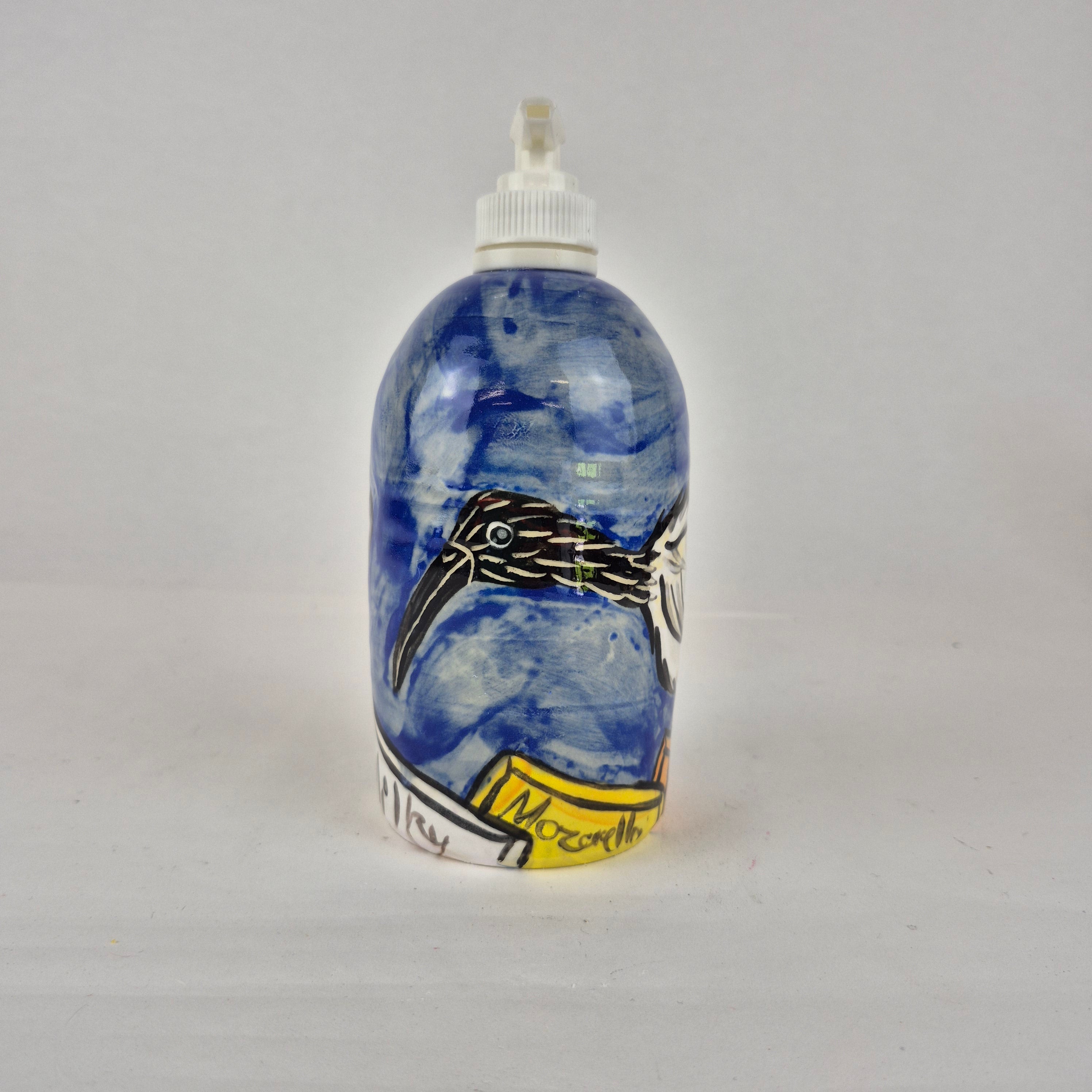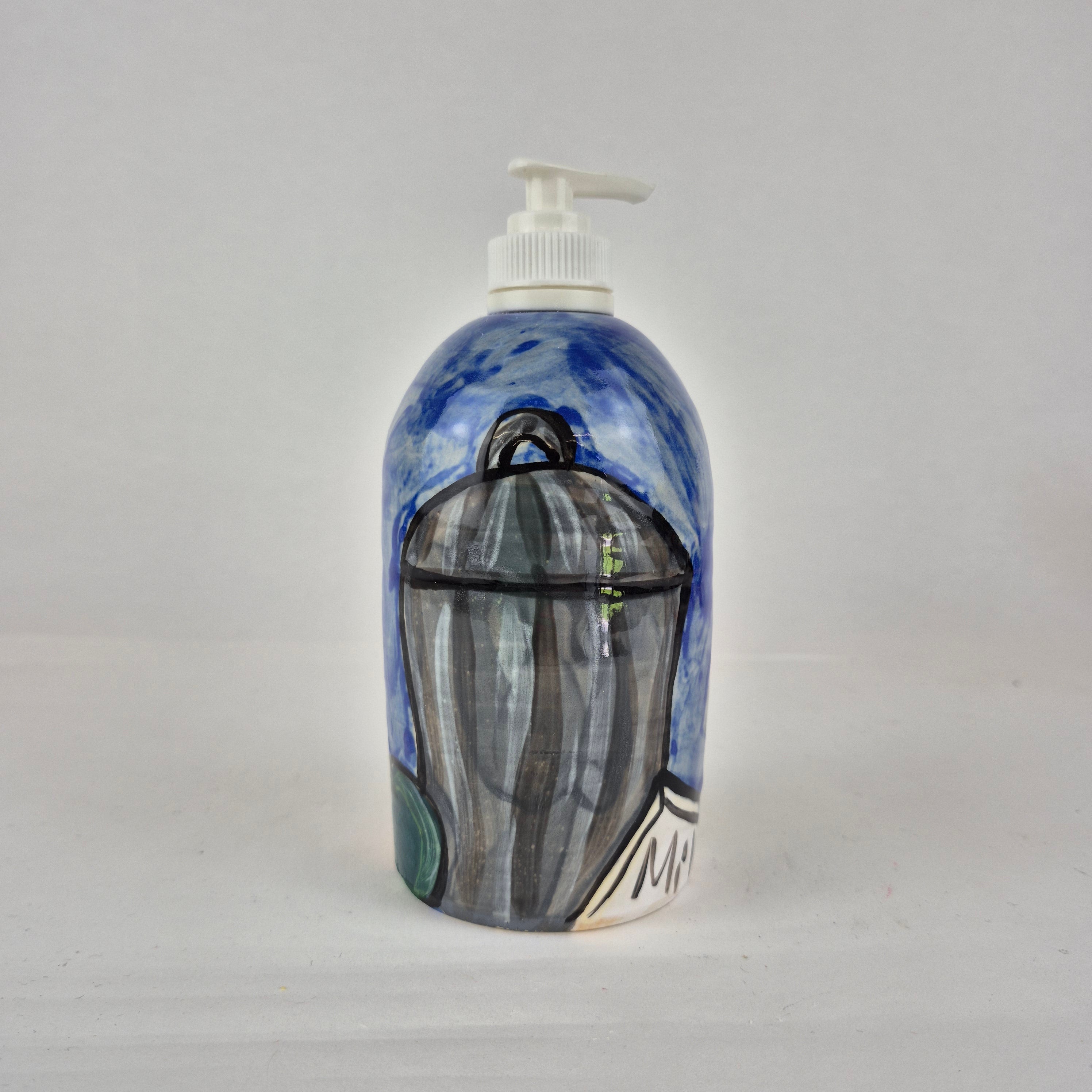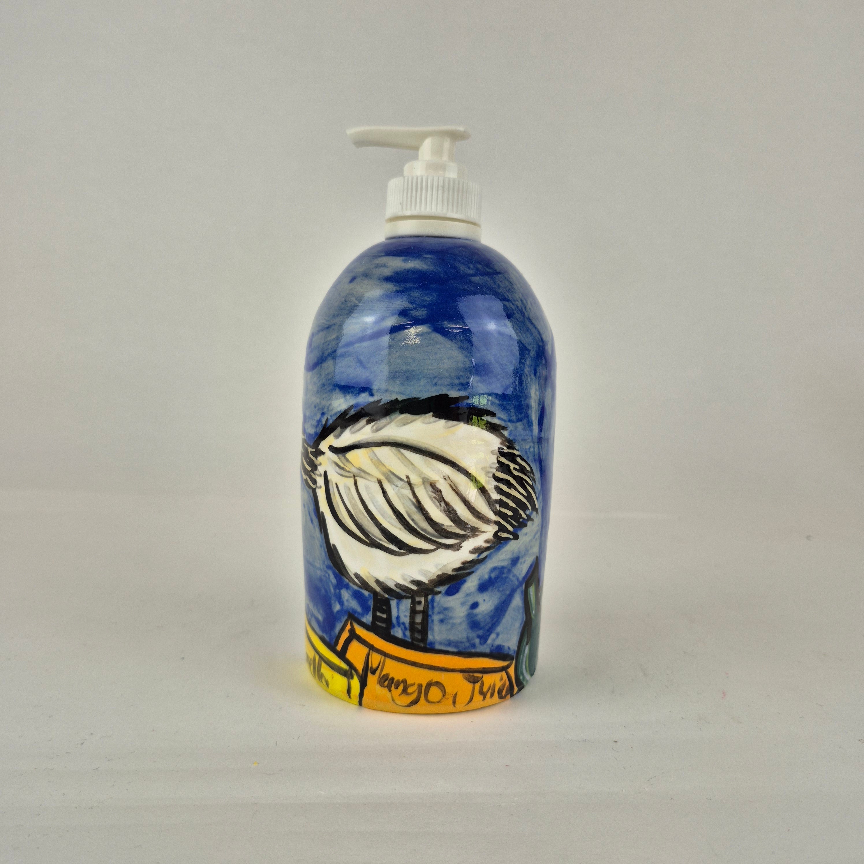 Bathroom Soap Dispenser been thrown out of SWE clay and decorated in underglaze colours with a clear glaze.