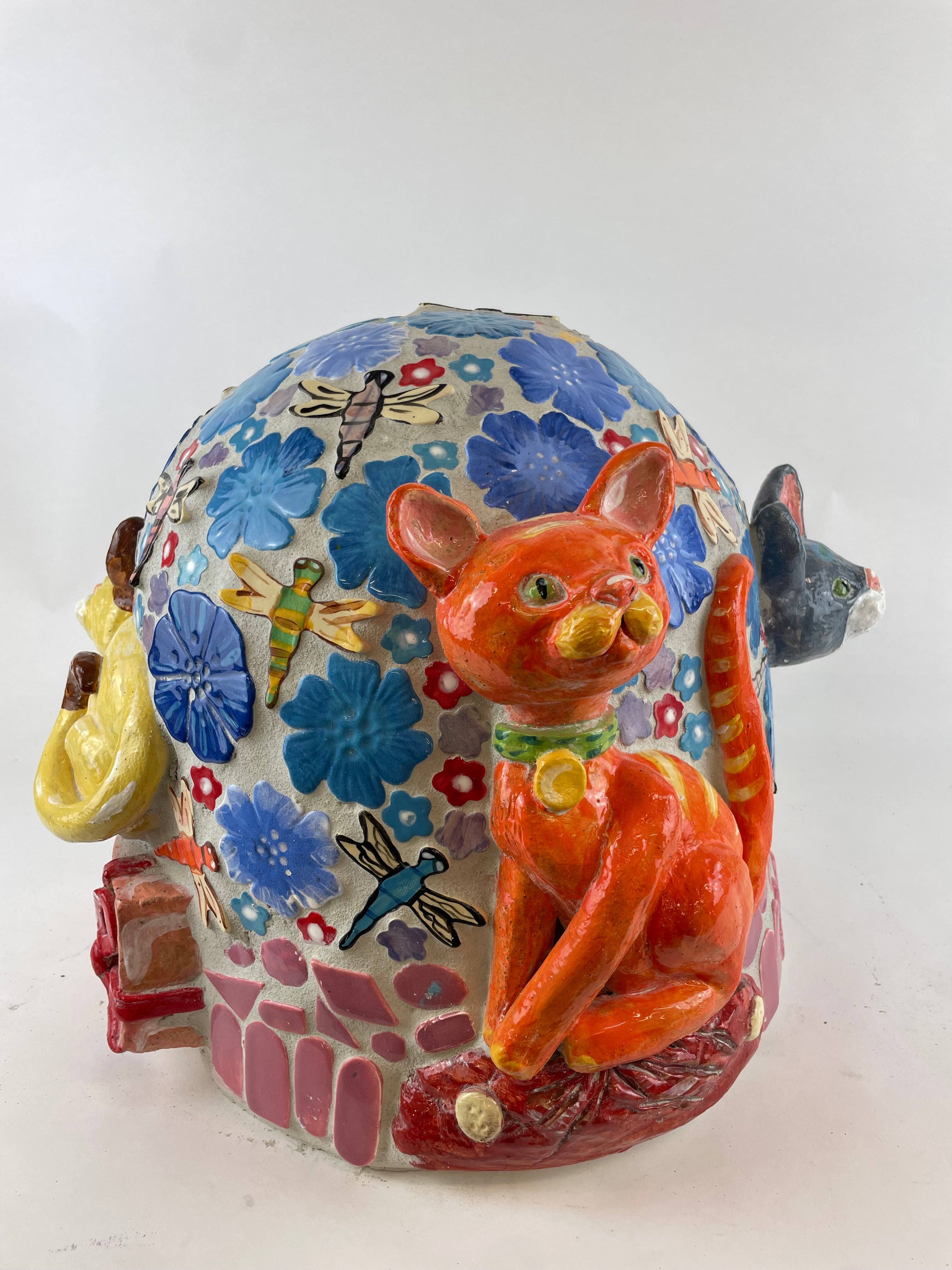 Hand Built out of BRT clay, mosaicked and is suitable for indoor or outdoor use.