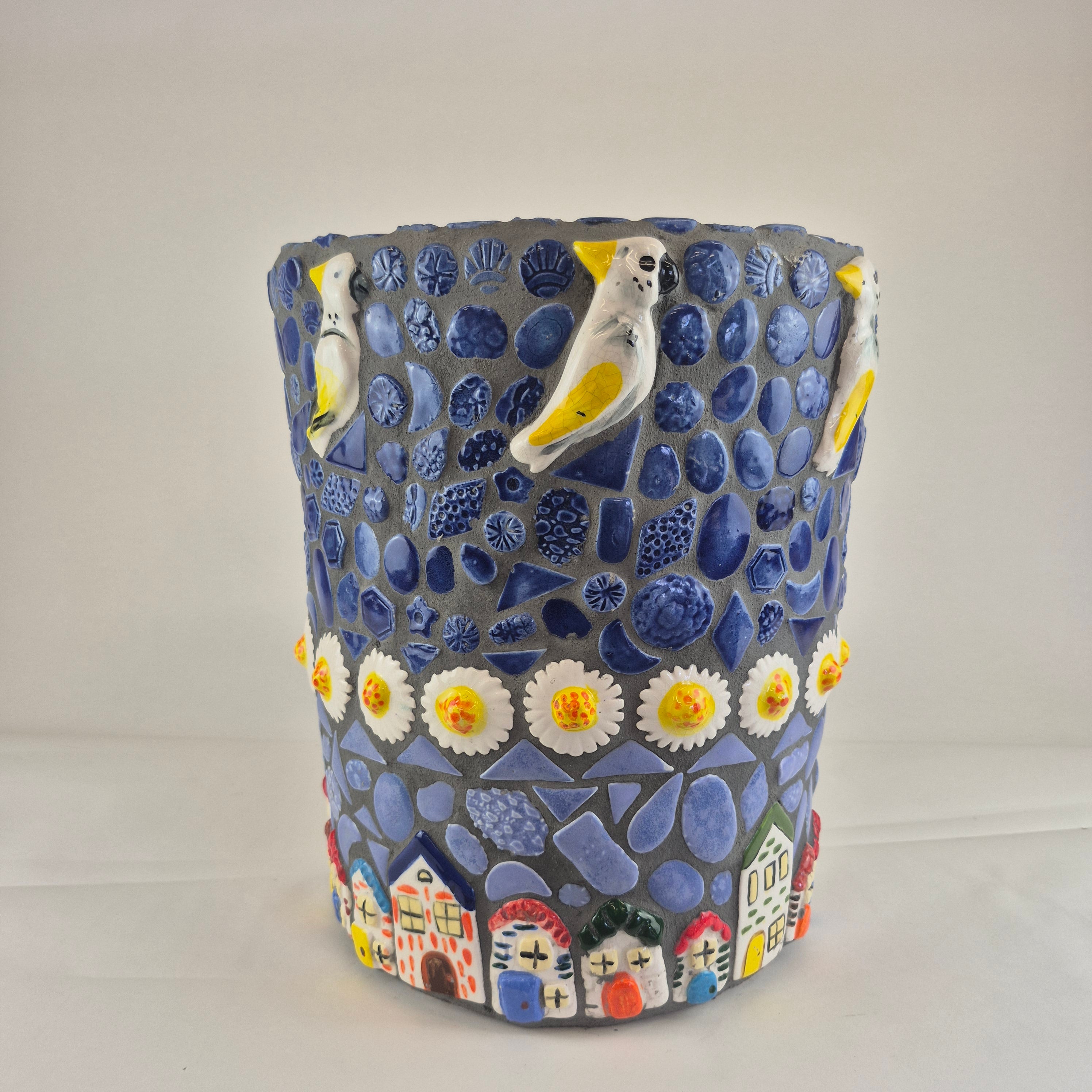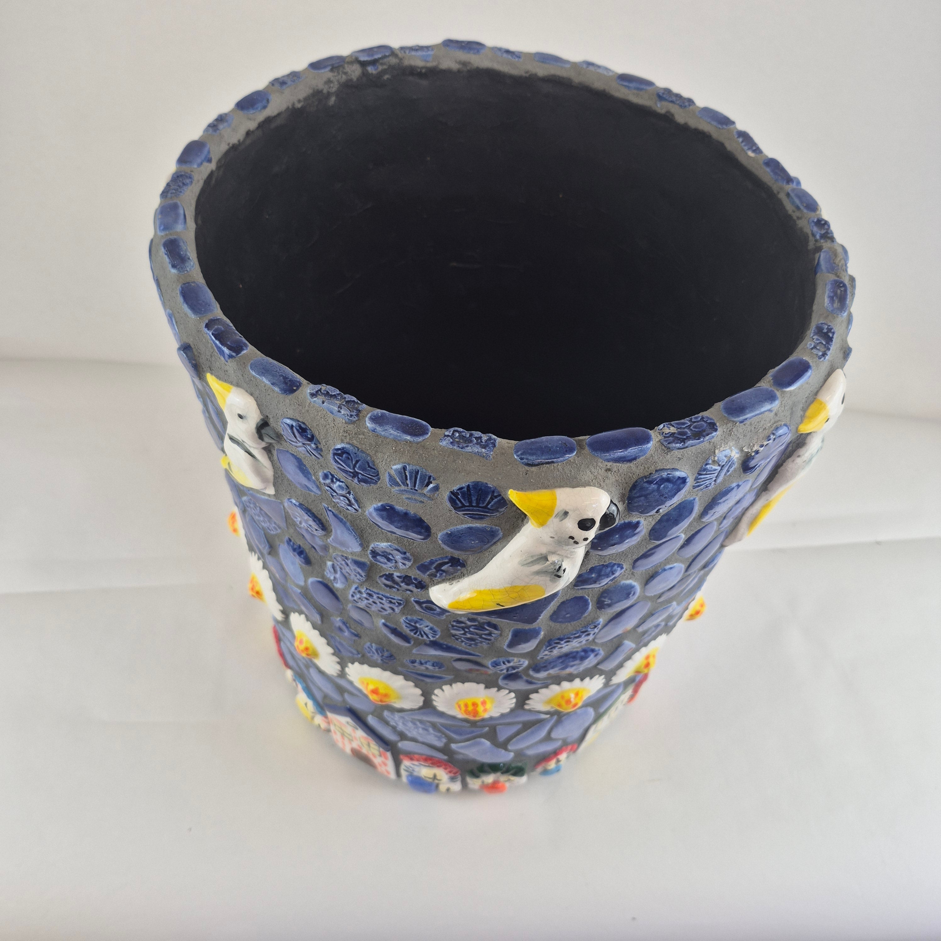 Hand Built out of BRT clay mosaicked and suitable for indoor or outdoor use including drainage holes in the bottom of the planter.