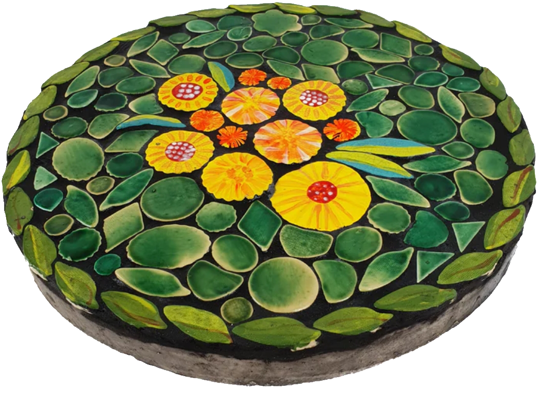 You will be provided with a concrete stepping stone that you will mosaic with handmade Monte Lupo tiles. You will lay your design out then glue onto the concrete paver. Once you have completed gluing the tiles to the paver you will grout your paver.