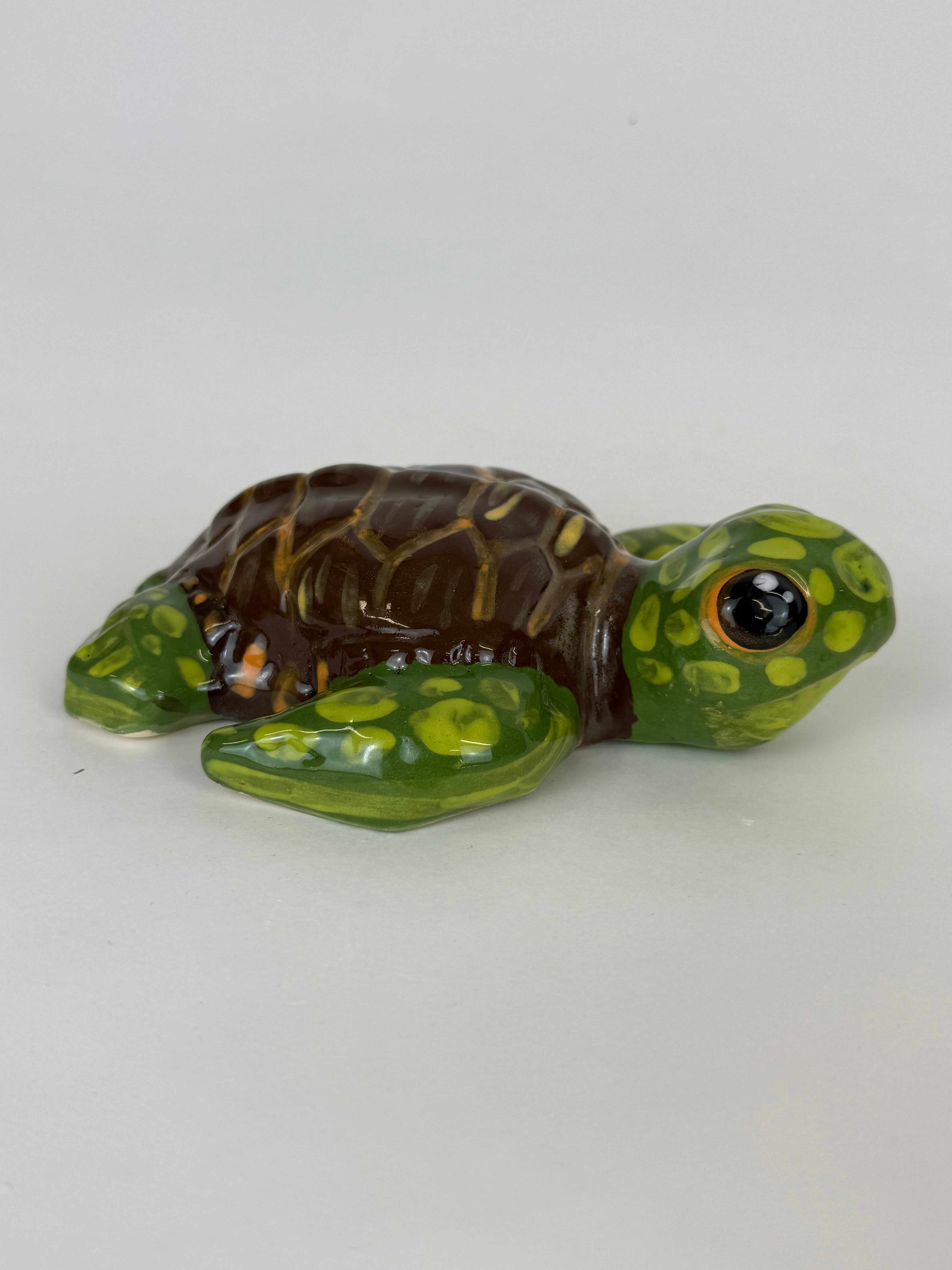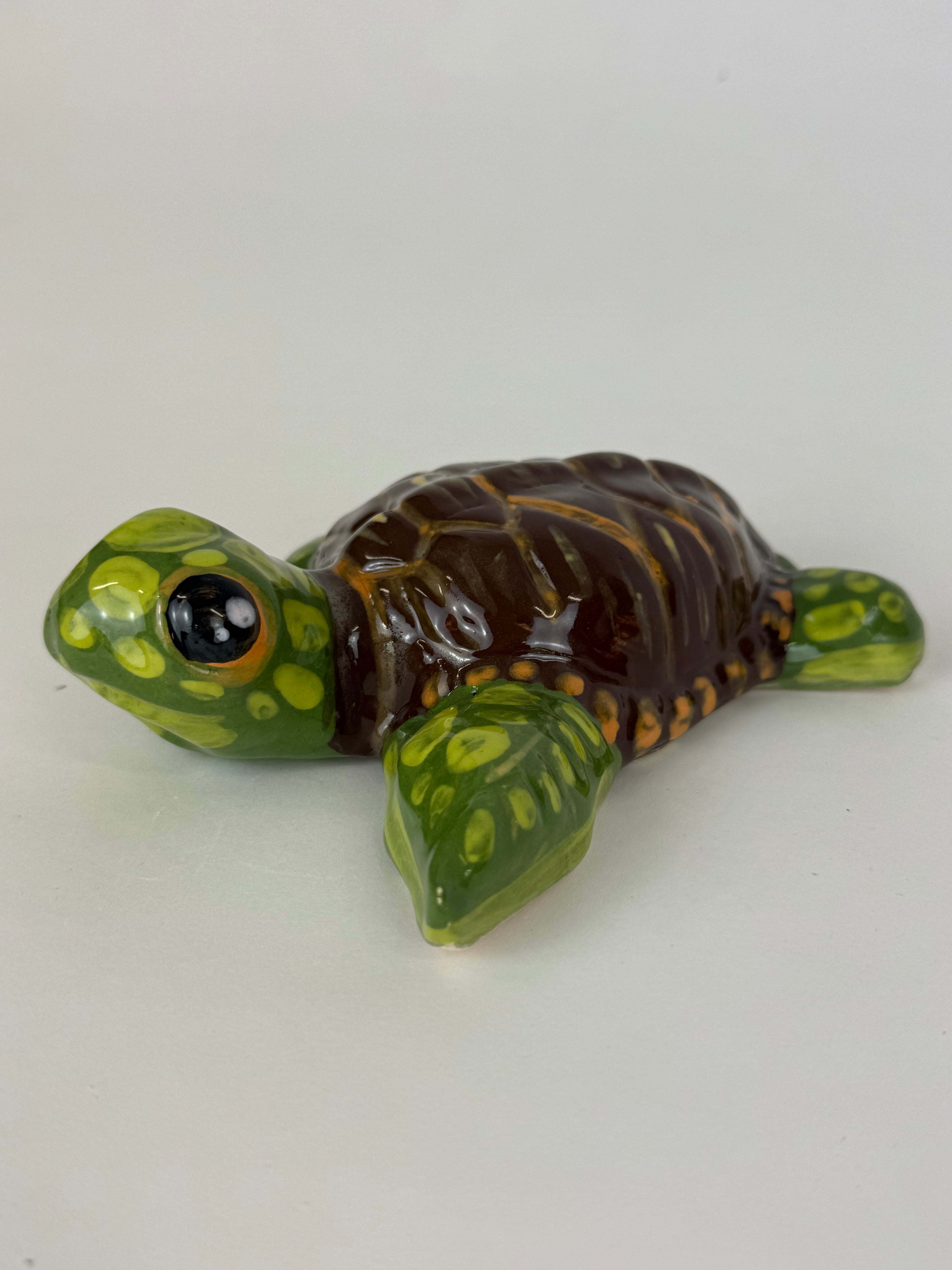 This adorable baby turtle is hand sculpted, handpainted with coloured underglaze colours and adorned with embellishments and finished with a clear glaze.