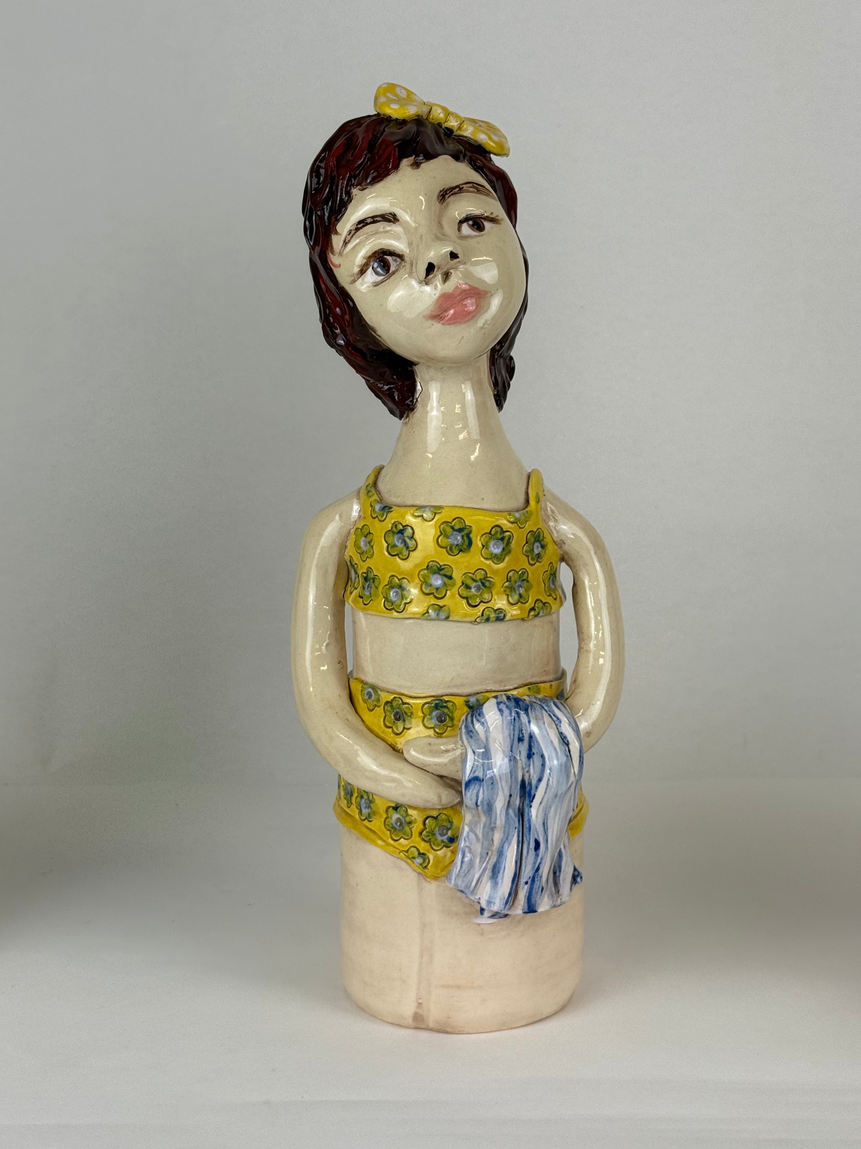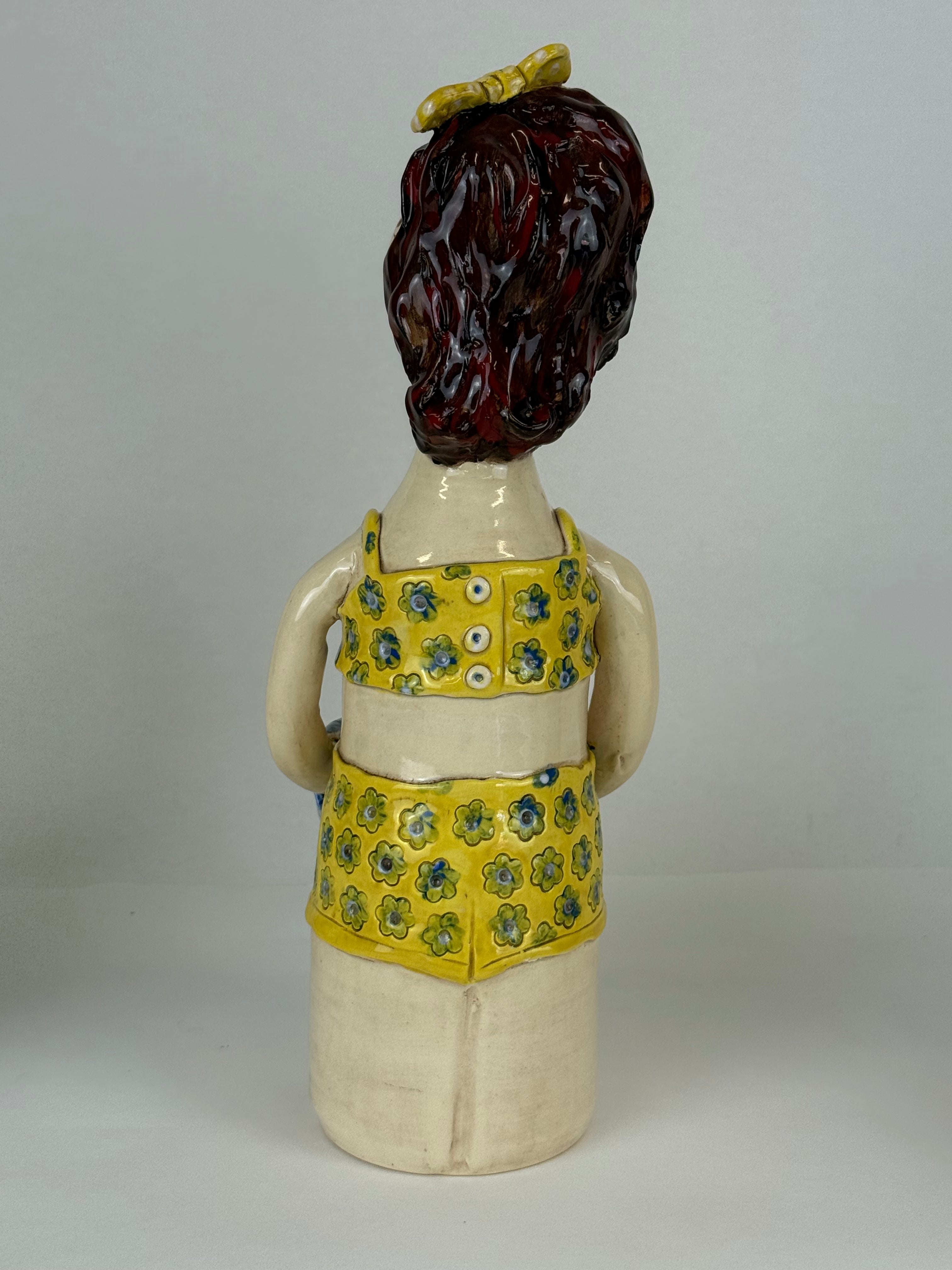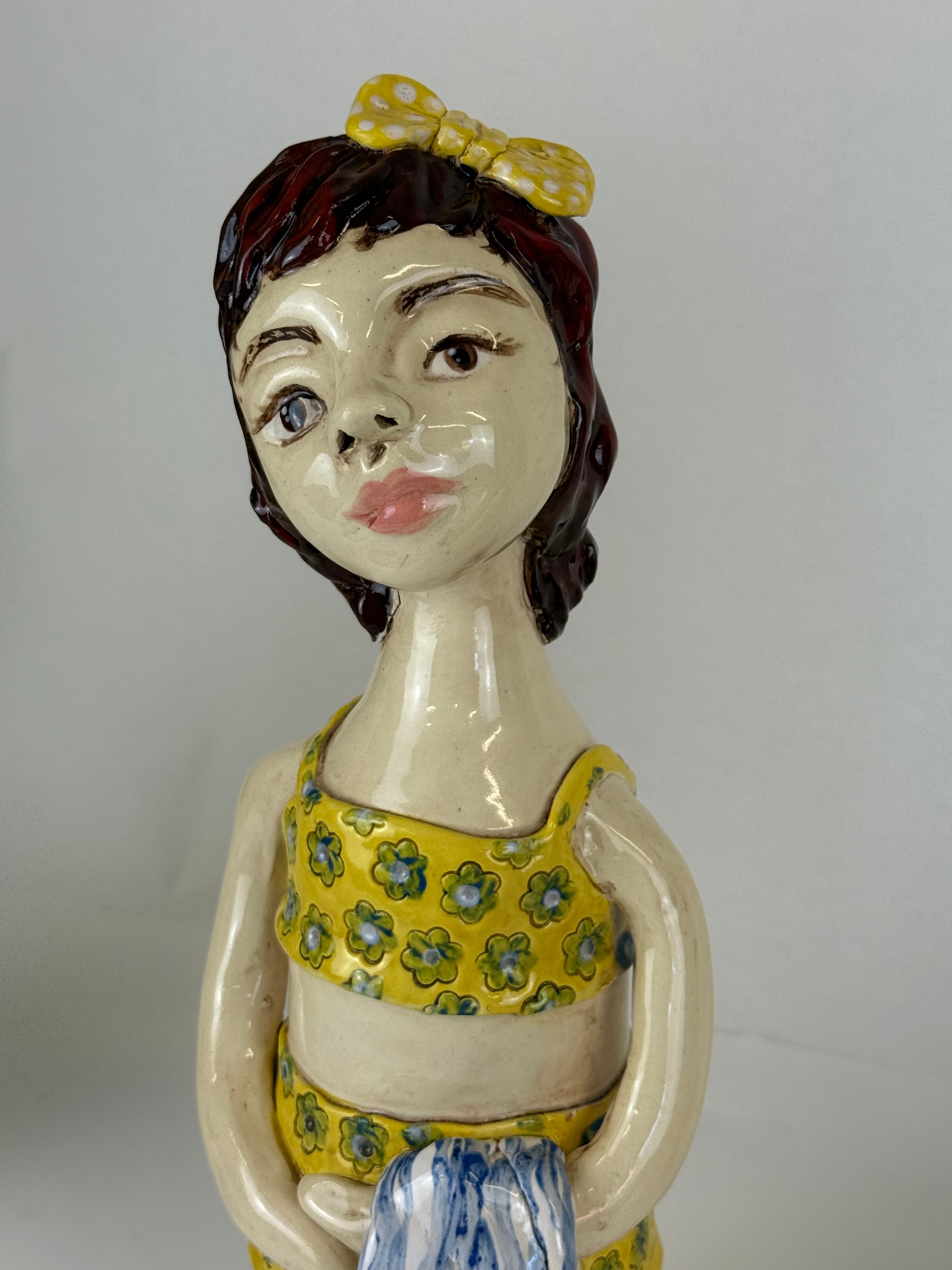 This sculpture is hand-sculpted and then handpainted with coloured underglaze colours and adorned with embellishments and finished with a clear glaze.