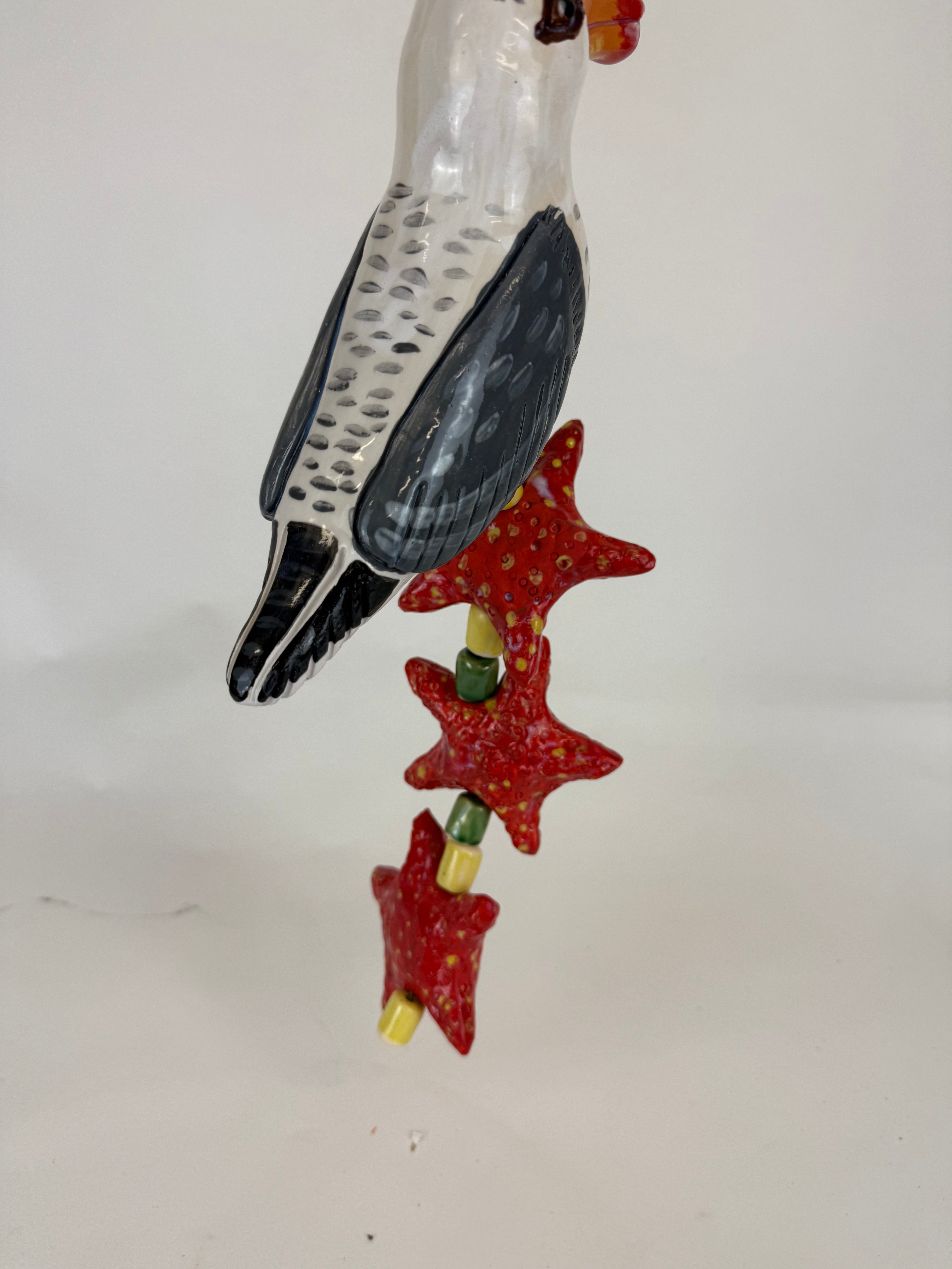 Hand carved, hand sculpted, and strung on a thick wire as a garden feature. Suitable for indoor and outdoor decor.