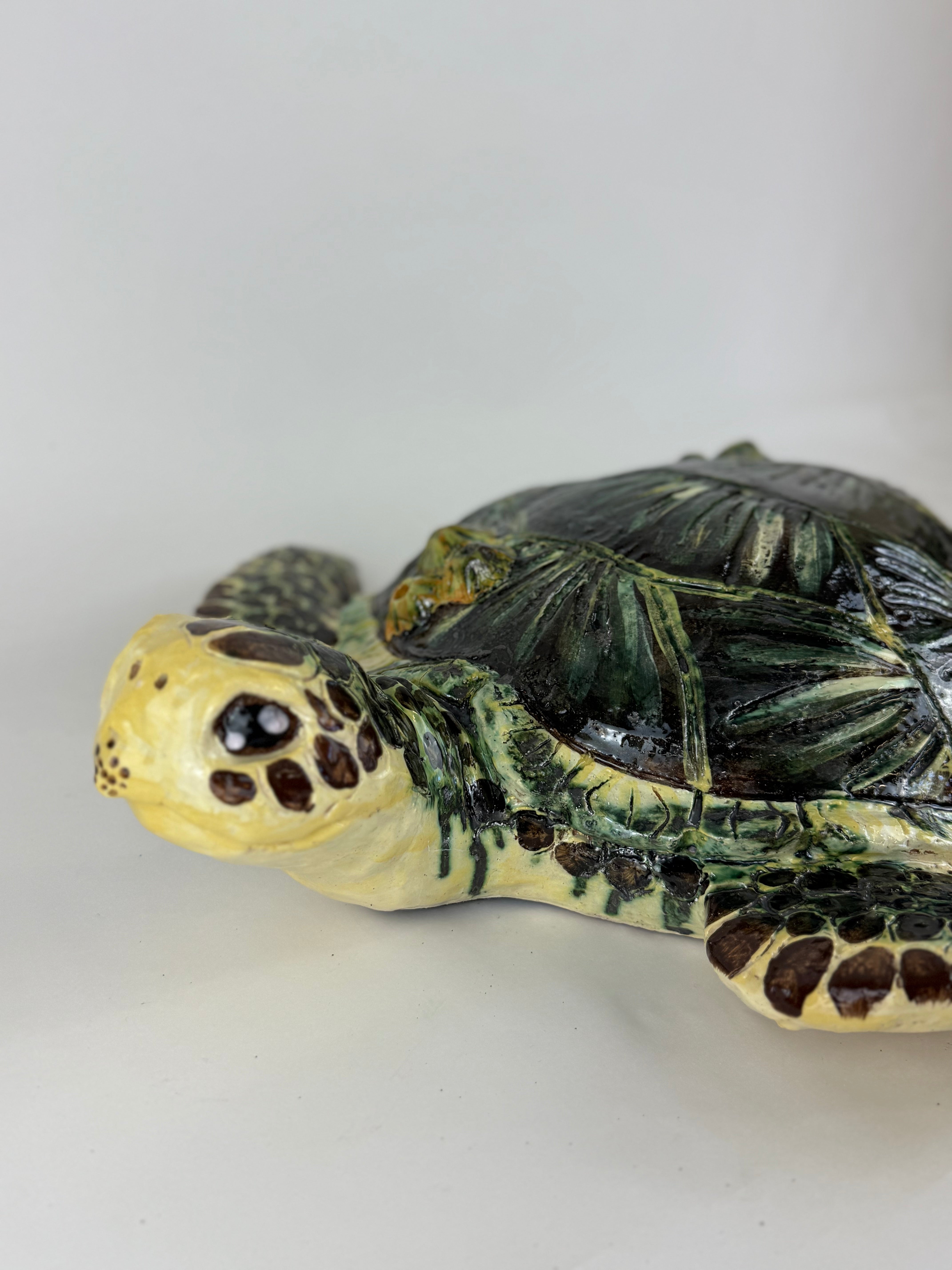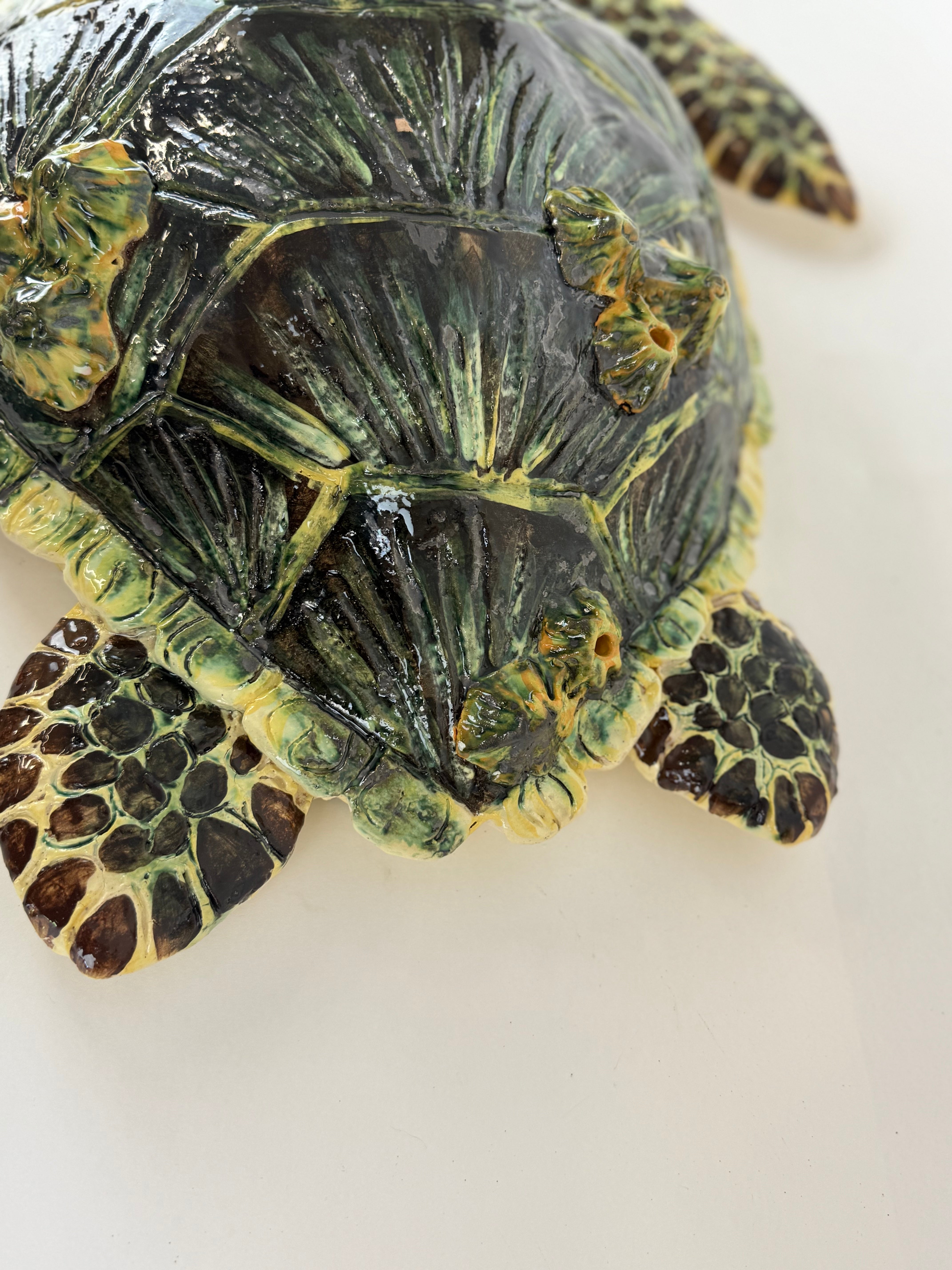 This large sea turtle is hand-made from BRT clay, painted with coloured slips and underglaze colours and adorned with embellishments