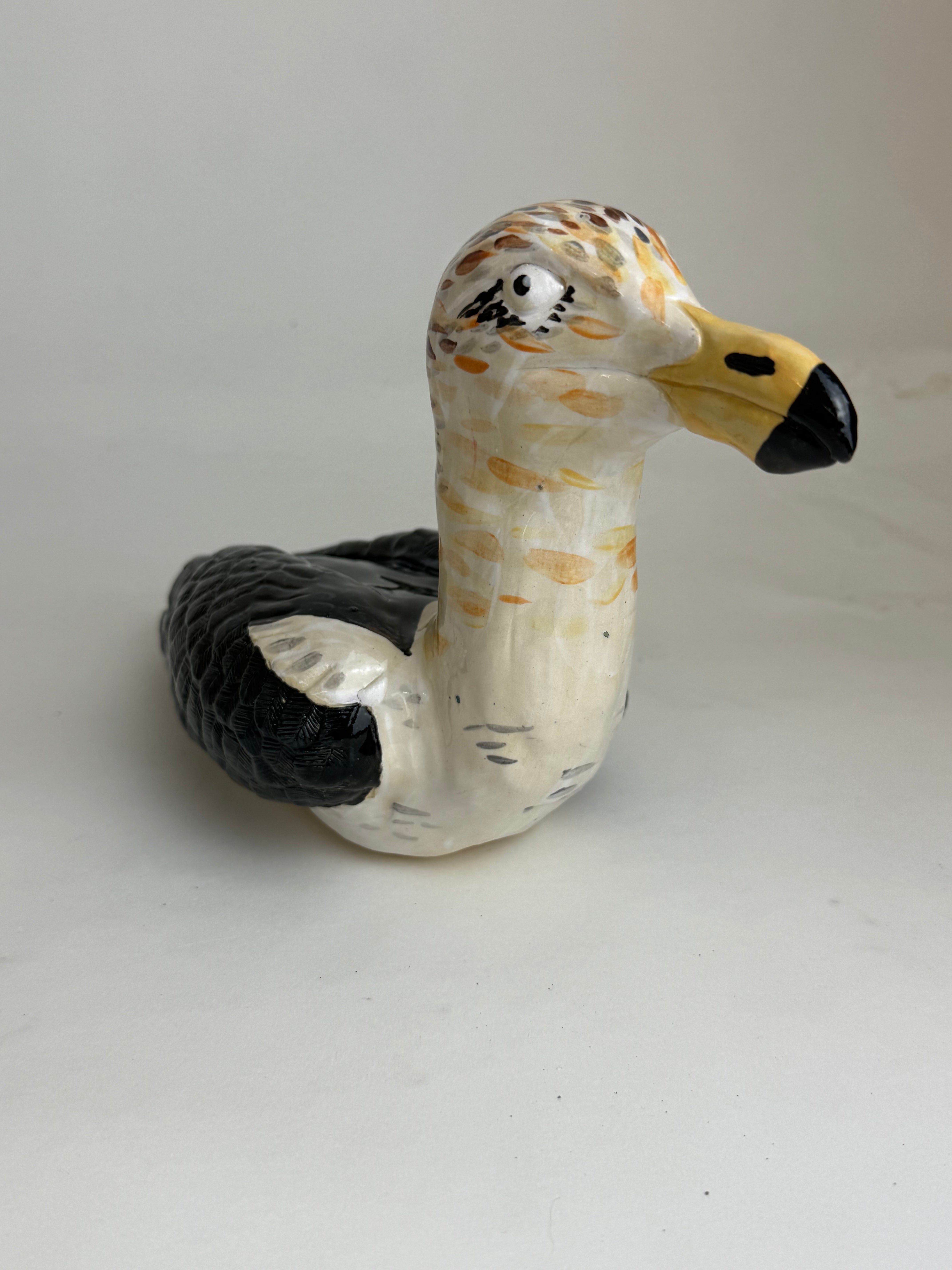 This sculpture is hand-sculpted and then handpainted with coloured underglaze colours and adorned with embellishments and finished with a clear glaze.
