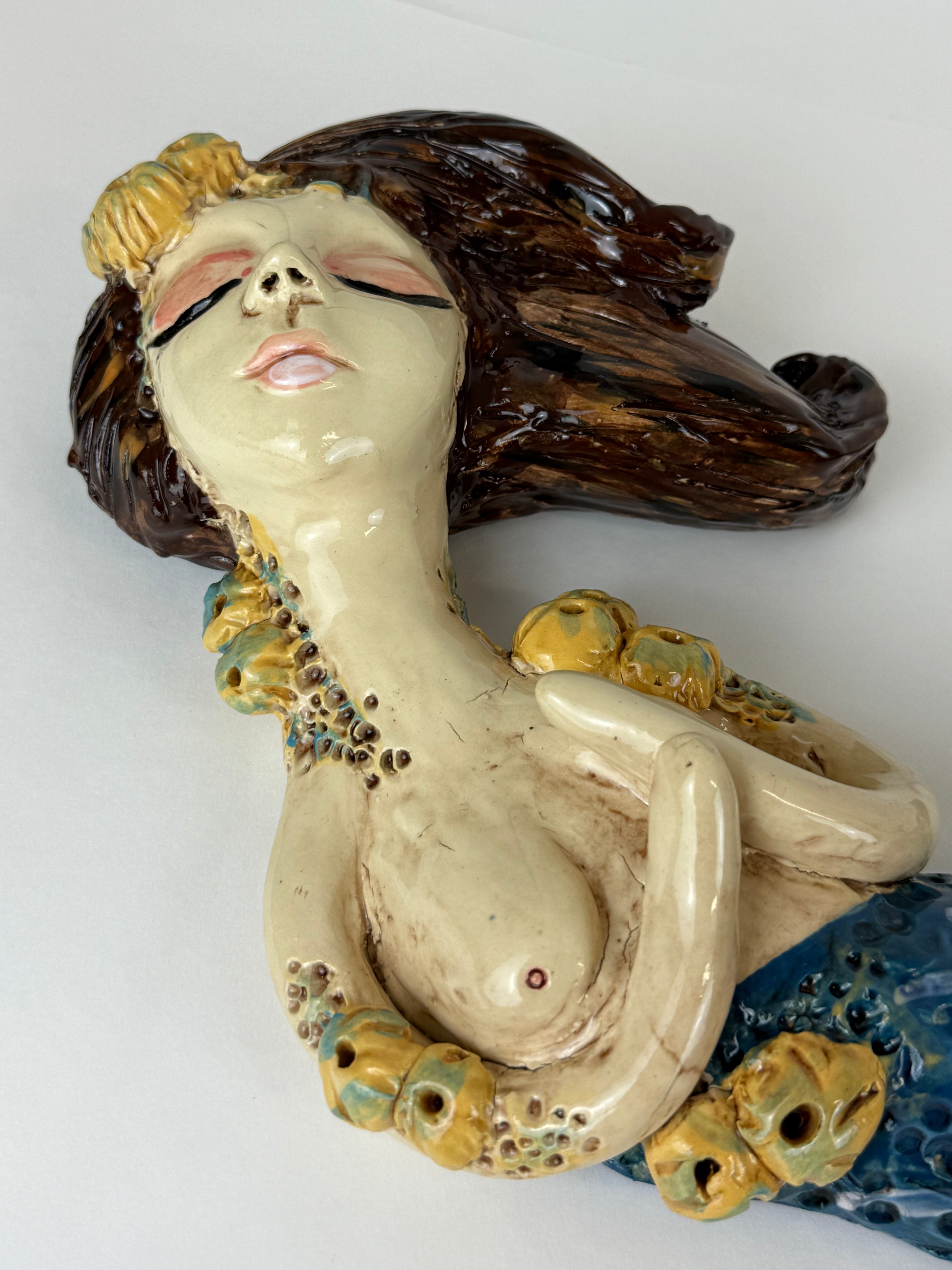 This wall mermaid handmade and sculpted and then handpainted with coloured underglaze colours and adorned with embellishments and finished with a clear glaze.
