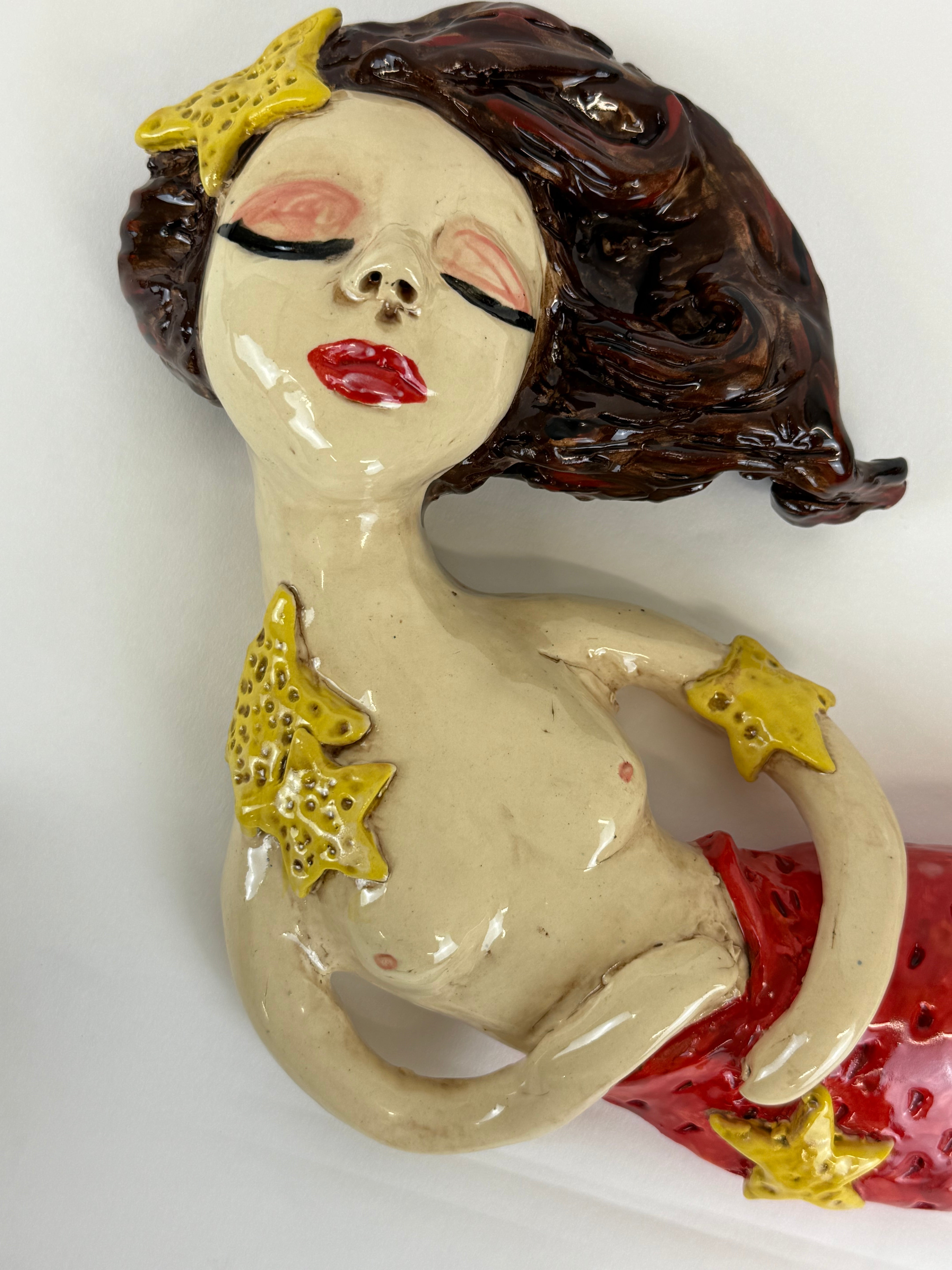 This wall mermaid handmade and sculpted and then handpainted with coloured underglaze colours and adorned with embellishments and finished with a clear glaze.