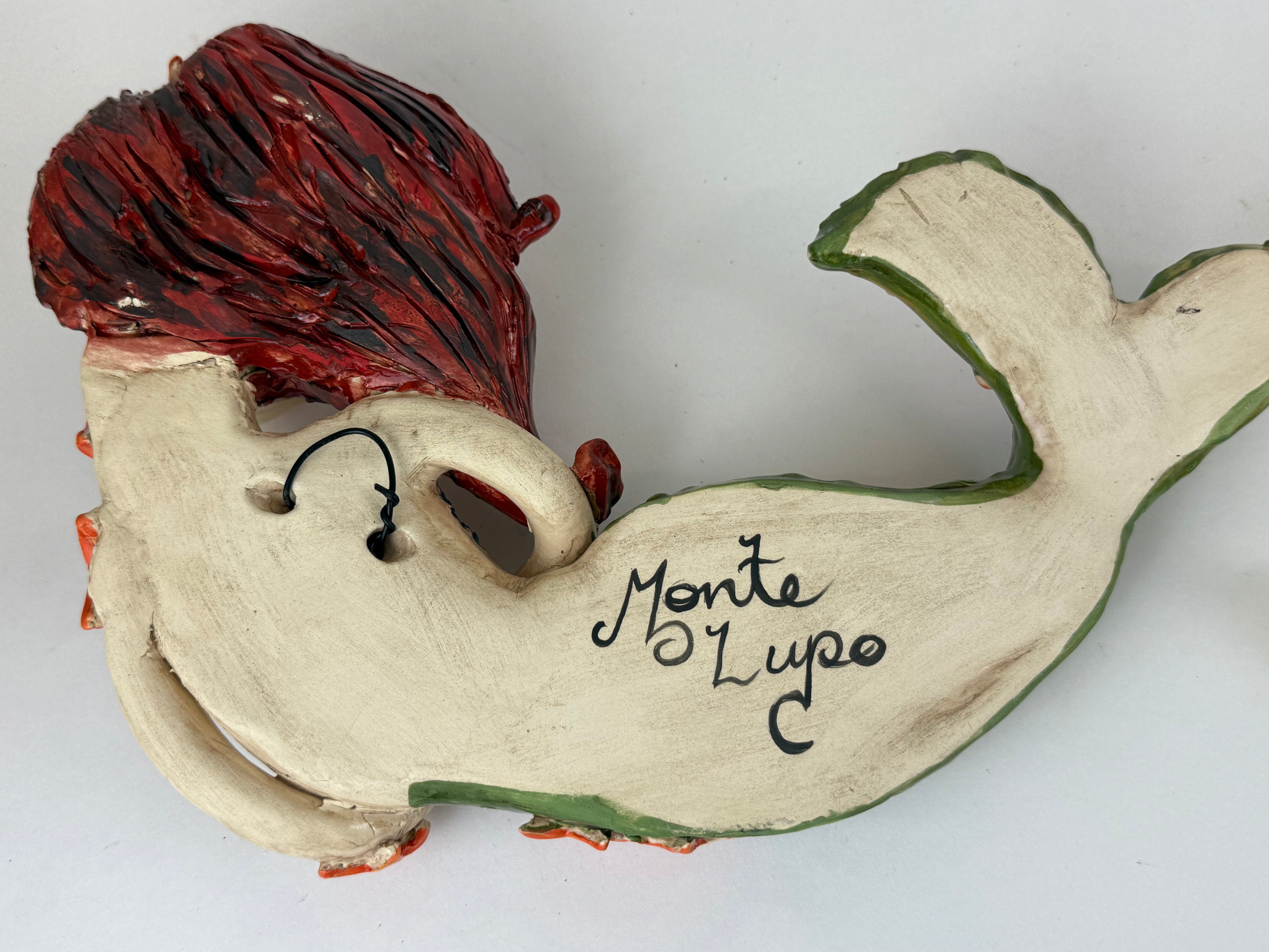 This wall merman handmade and sculpted and then handpainted with coloured underglaze colours and adorned with embellishments and finished with a clear glaze.
