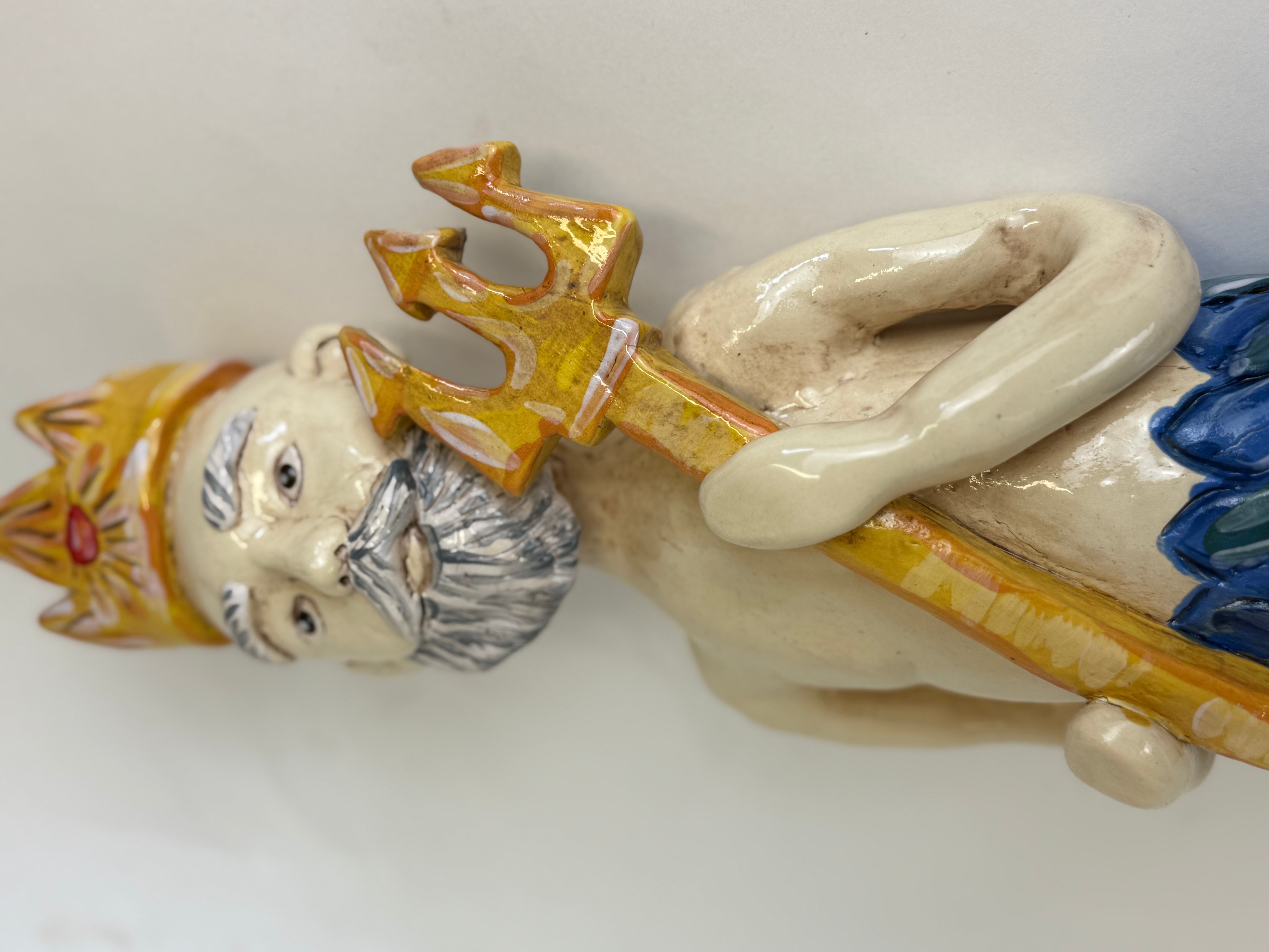 This wall merman handmade and sculpted and then handpainted with coloured underglaze colours and adorned with embellishments and finished with a clear glaze.