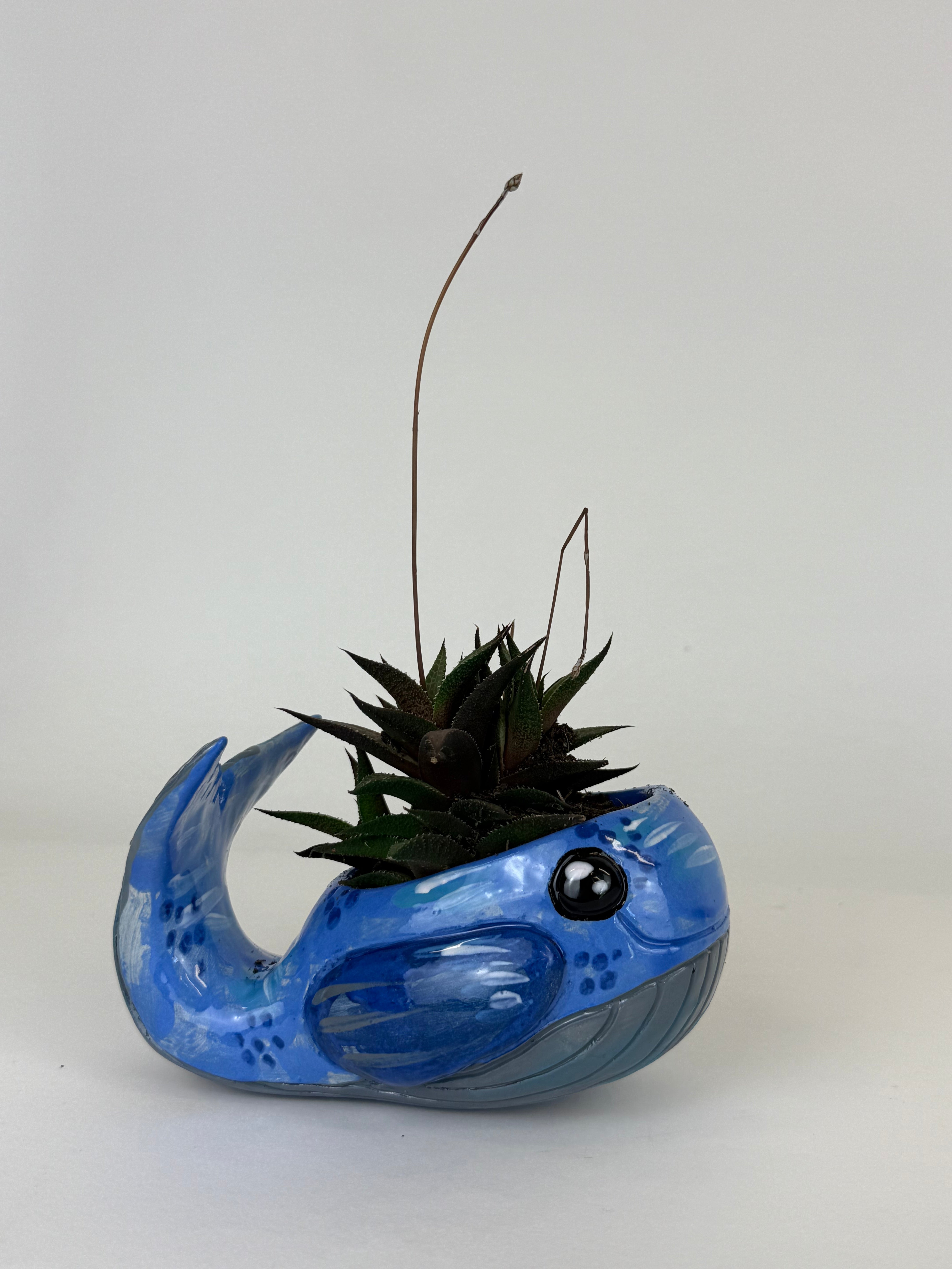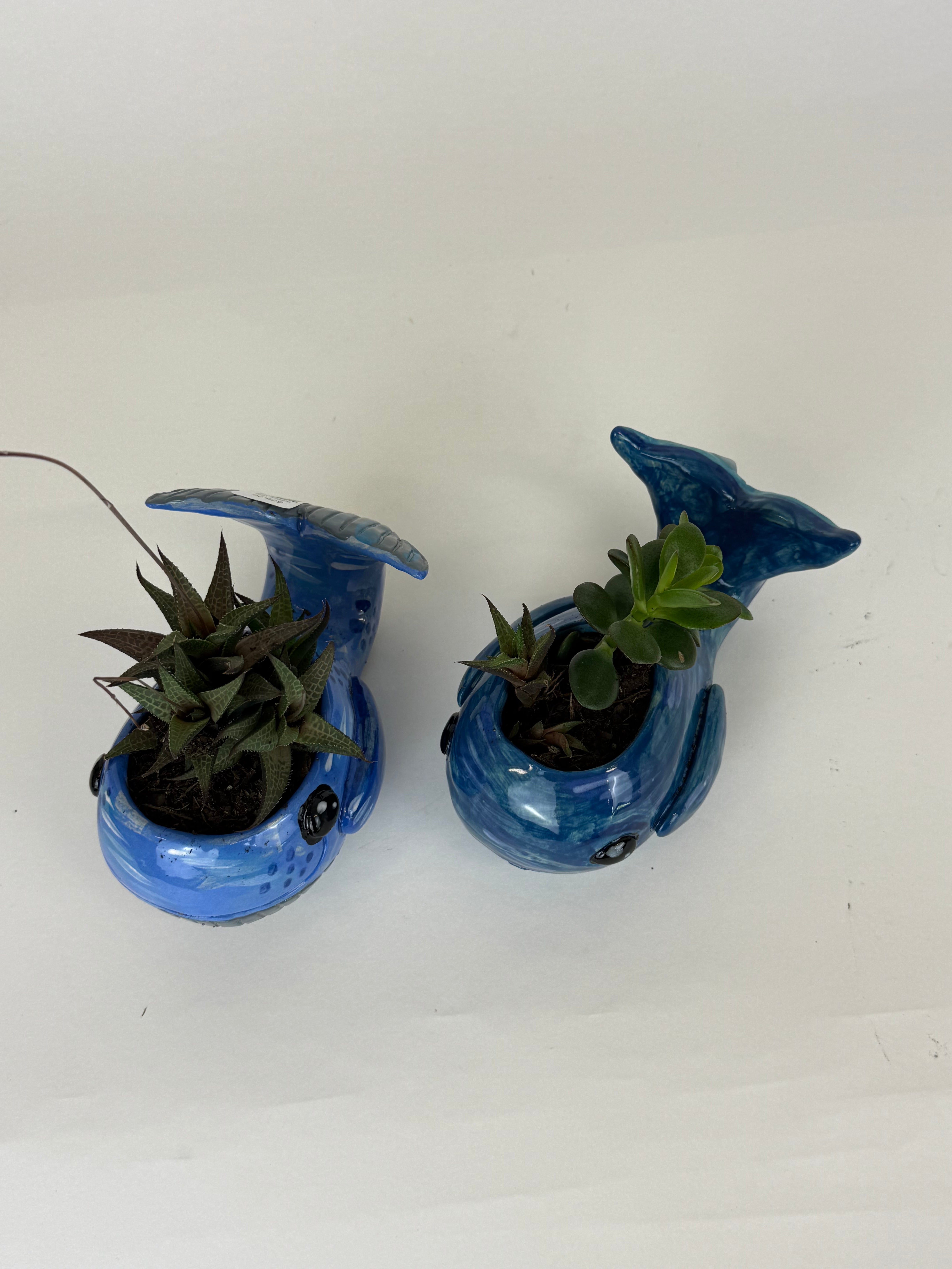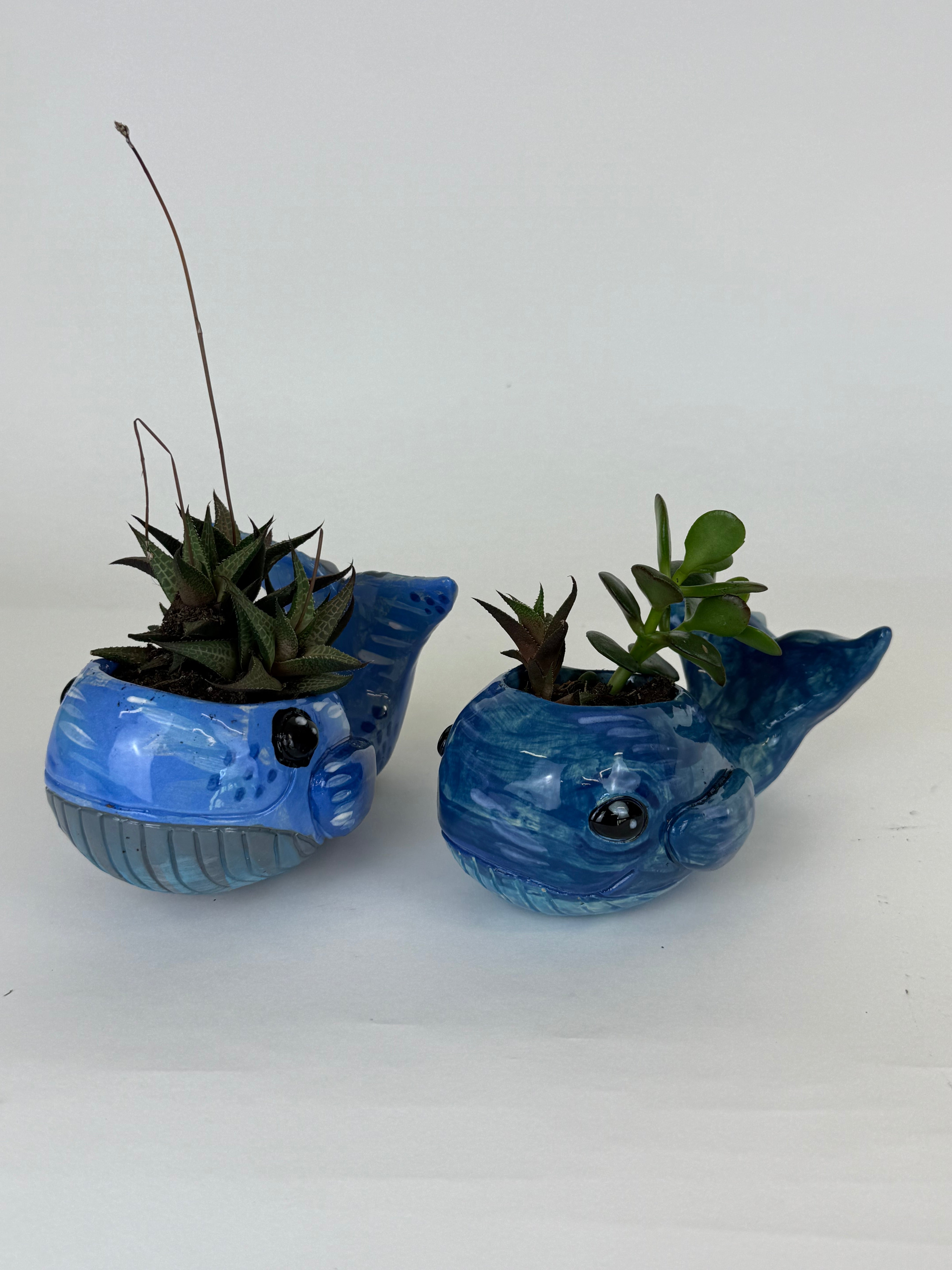 This adorable whale planter is hand sculpted, handpainted with coloured underglaze colours and adorned with embellishments and finished with a clear glaze. Complete with a succulent plant