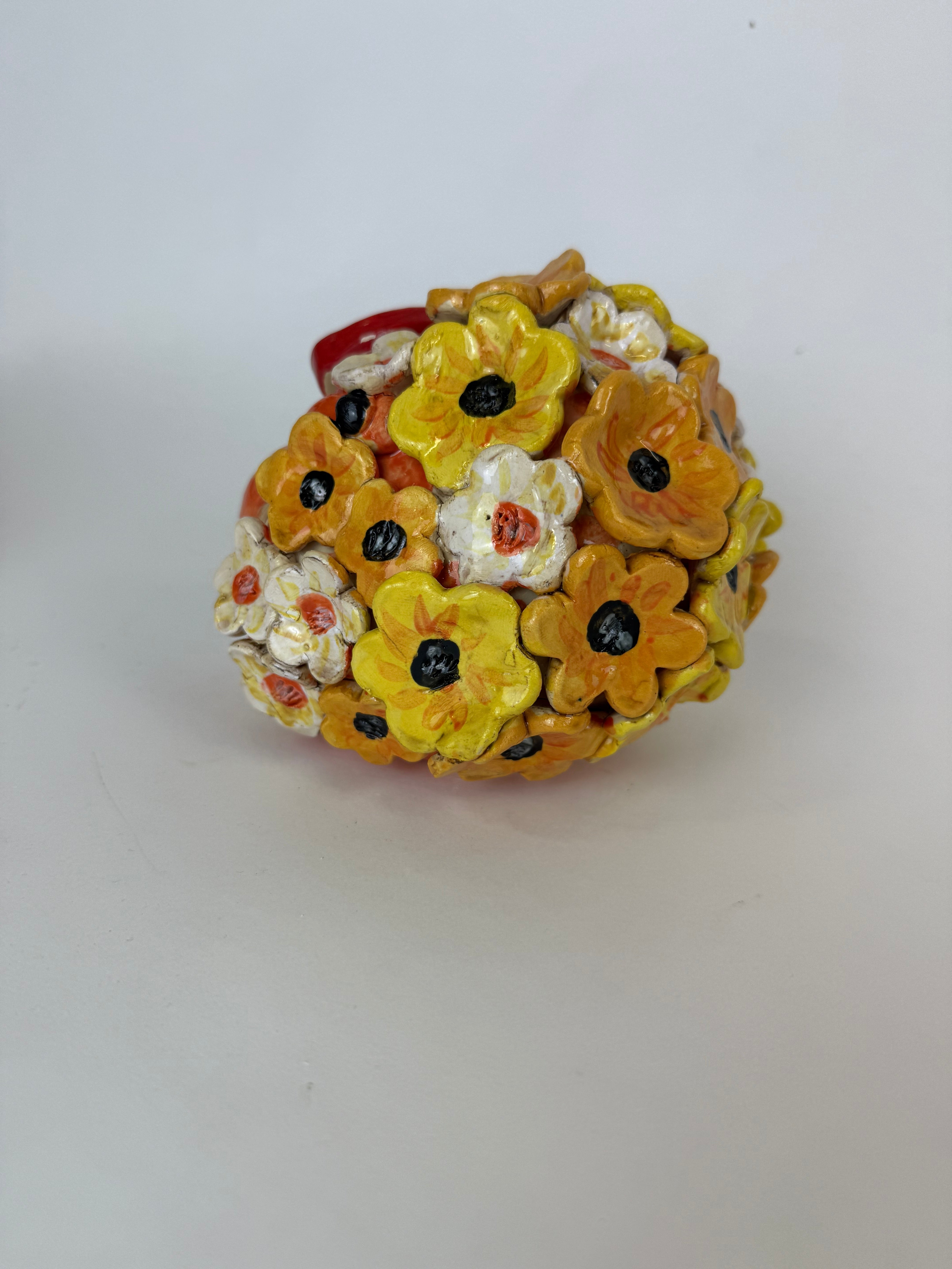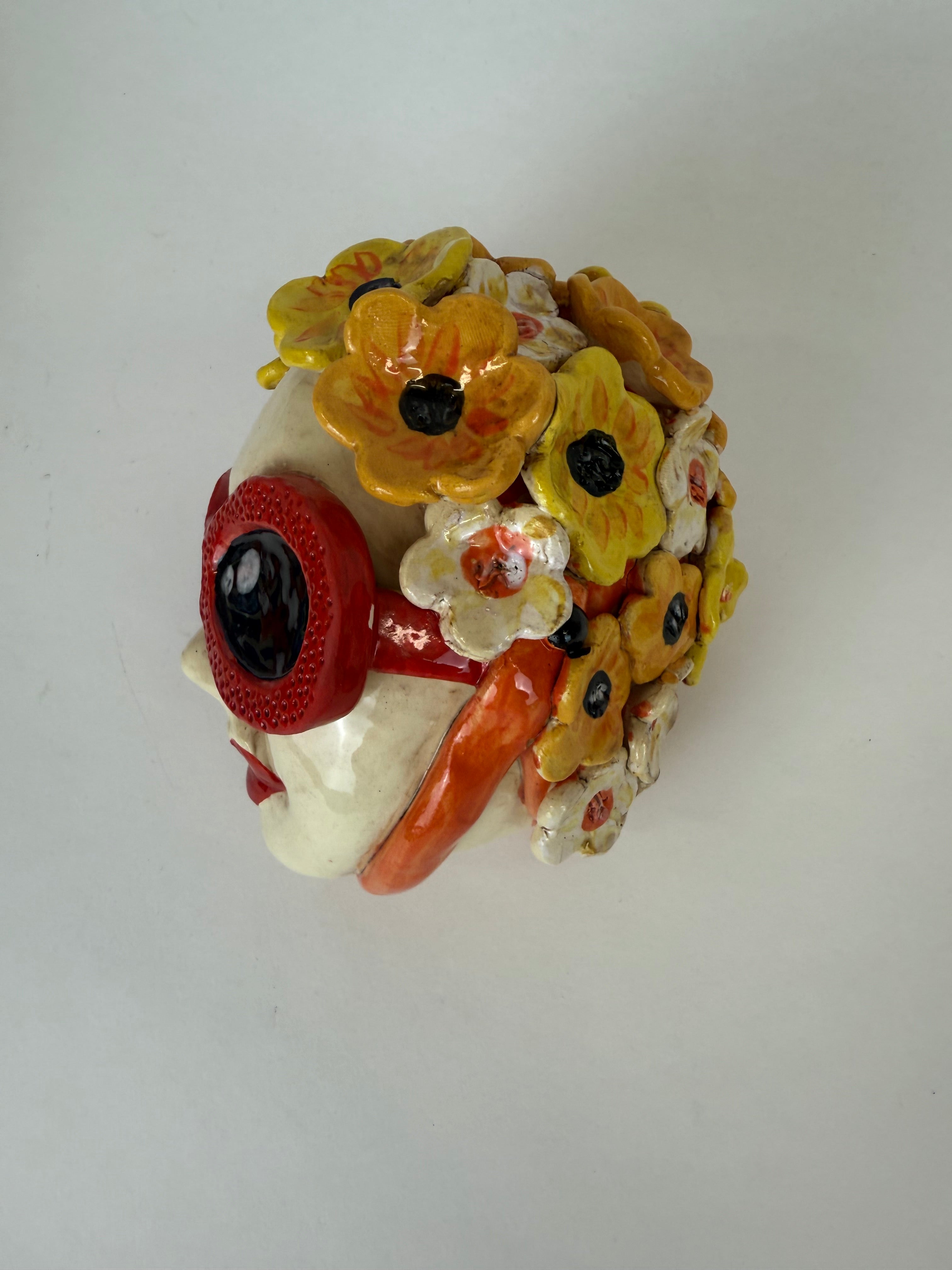 This sculpture is hand-sculpted and then handpainted with coloured underglaze colours and adorned with embellishments and finished with a clear glaze.