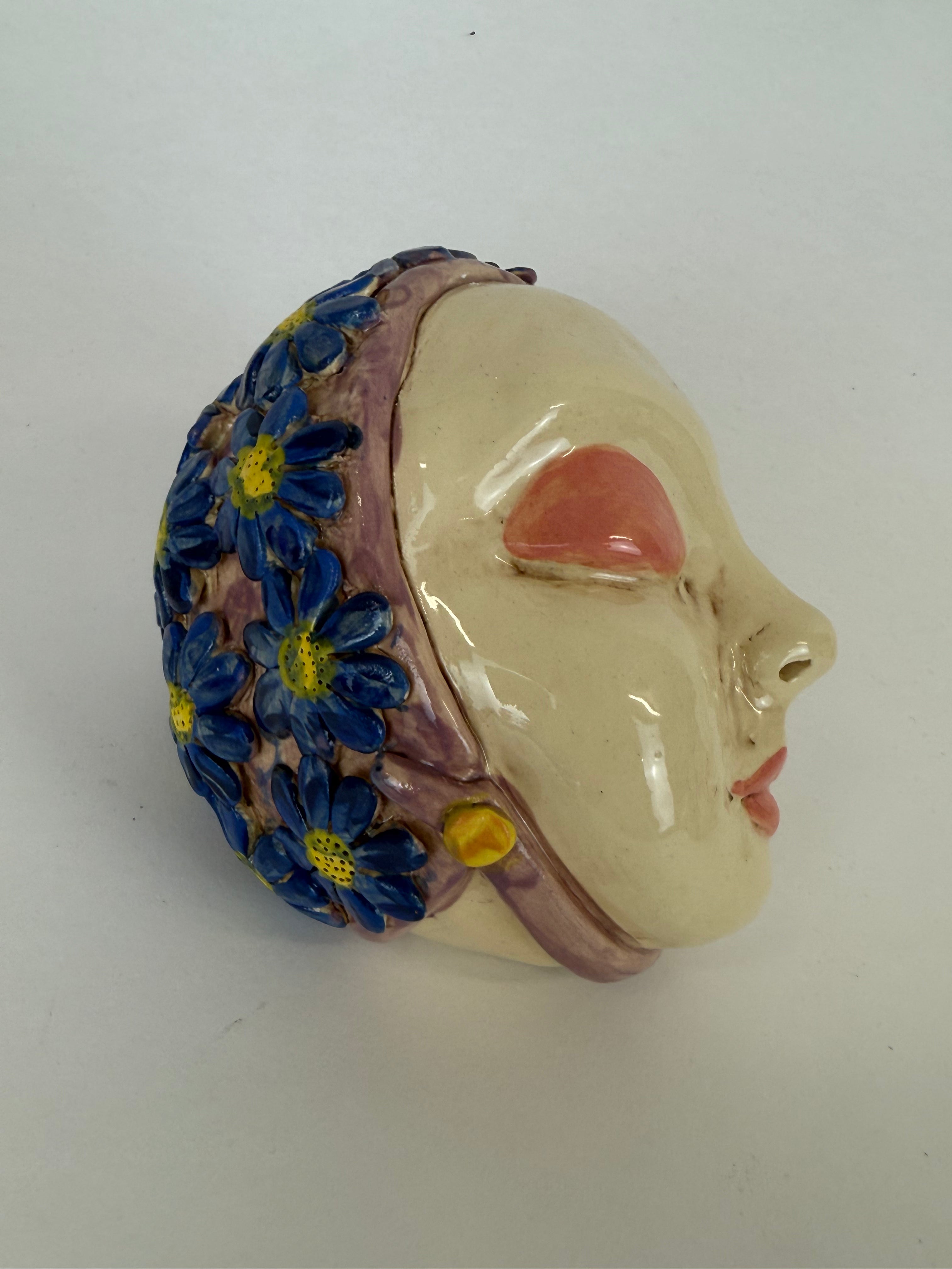 This sculpture is hand-sculpted and then handpainted with coloured underglaze colours and adorned with embellishments and finished with a clear glaze.