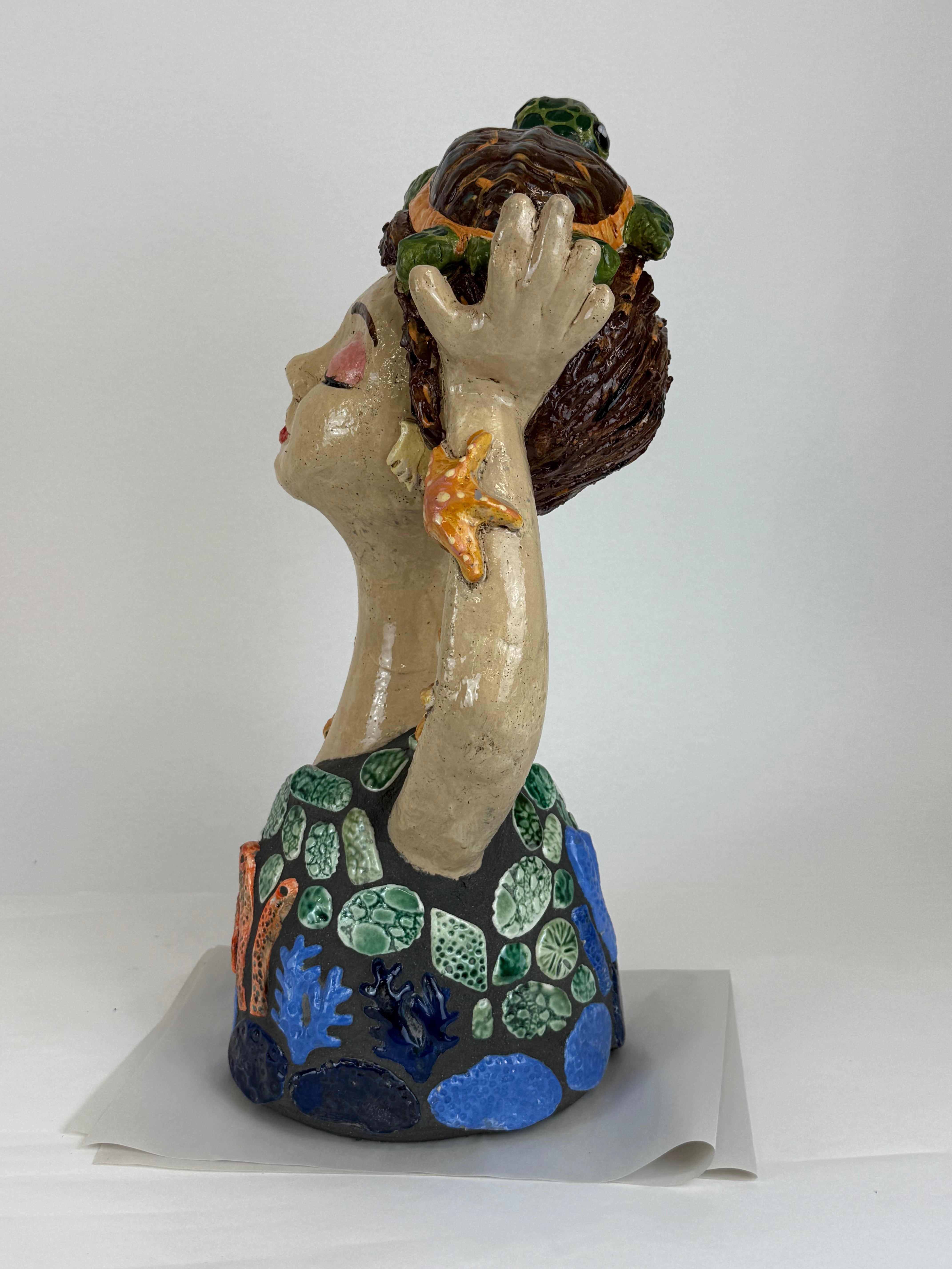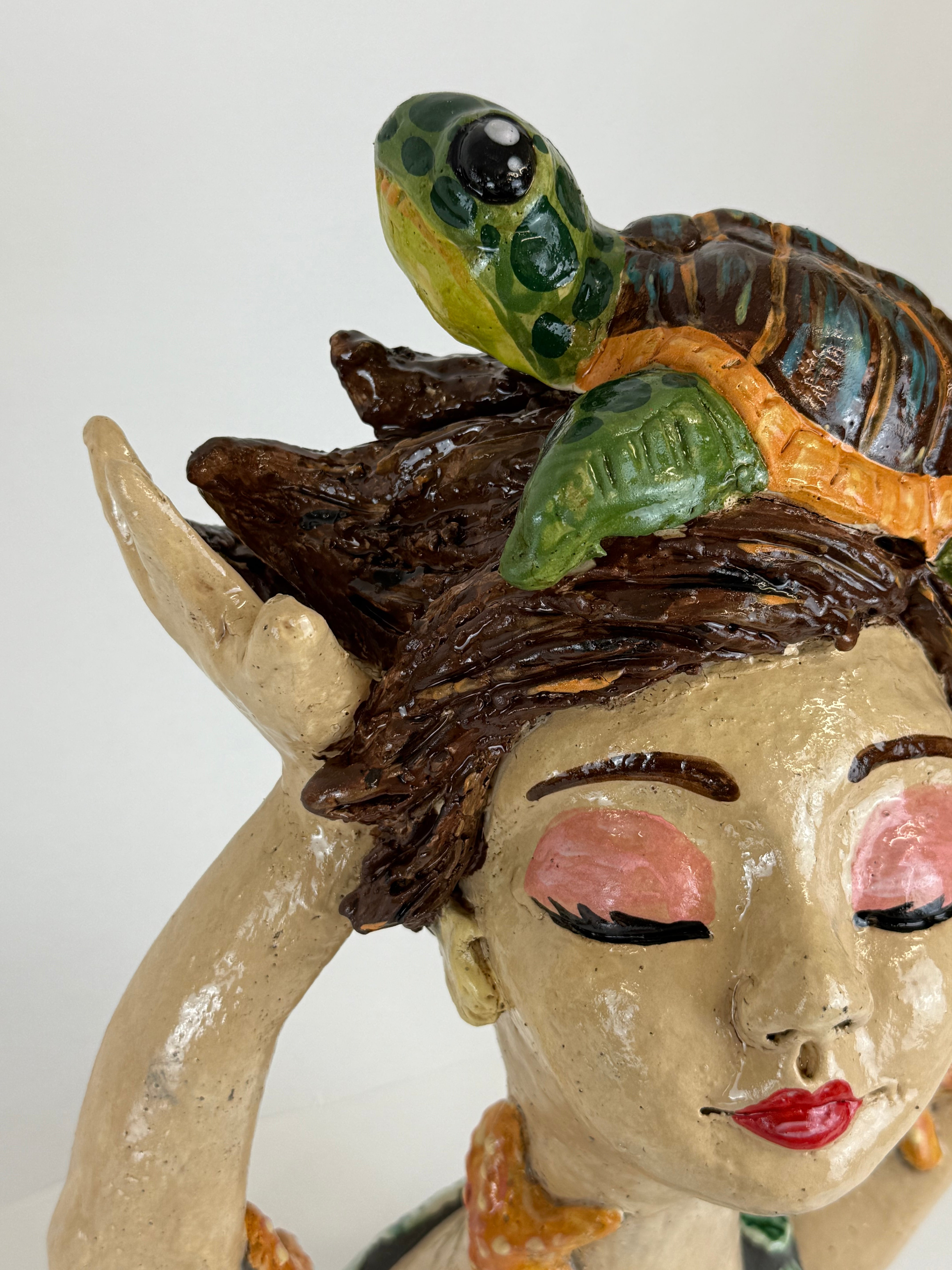 This small garden dweller is made from BRT clay, painted with coloured slips and underglaze colours and adorned with embellishments and mosaic tiles..