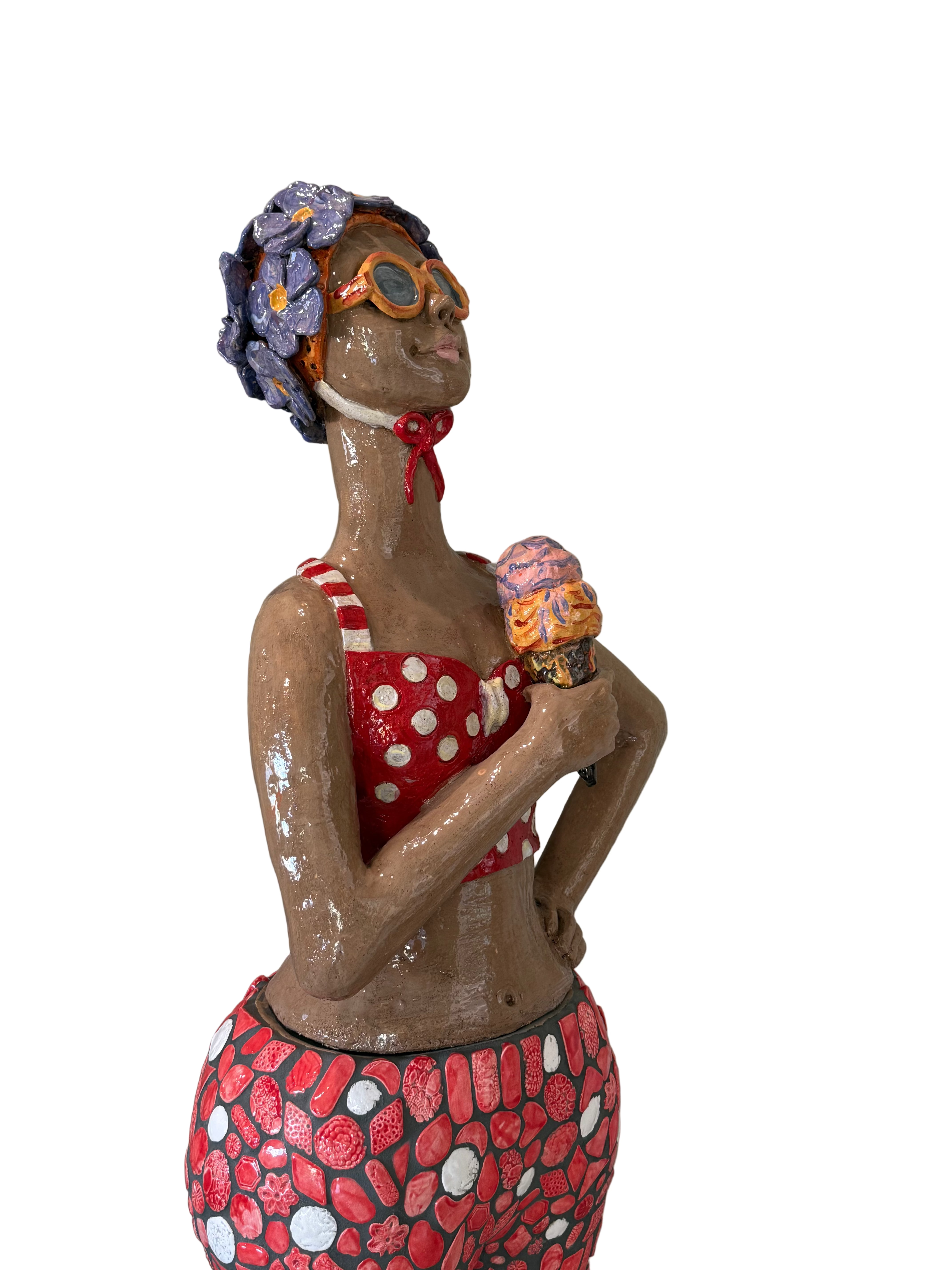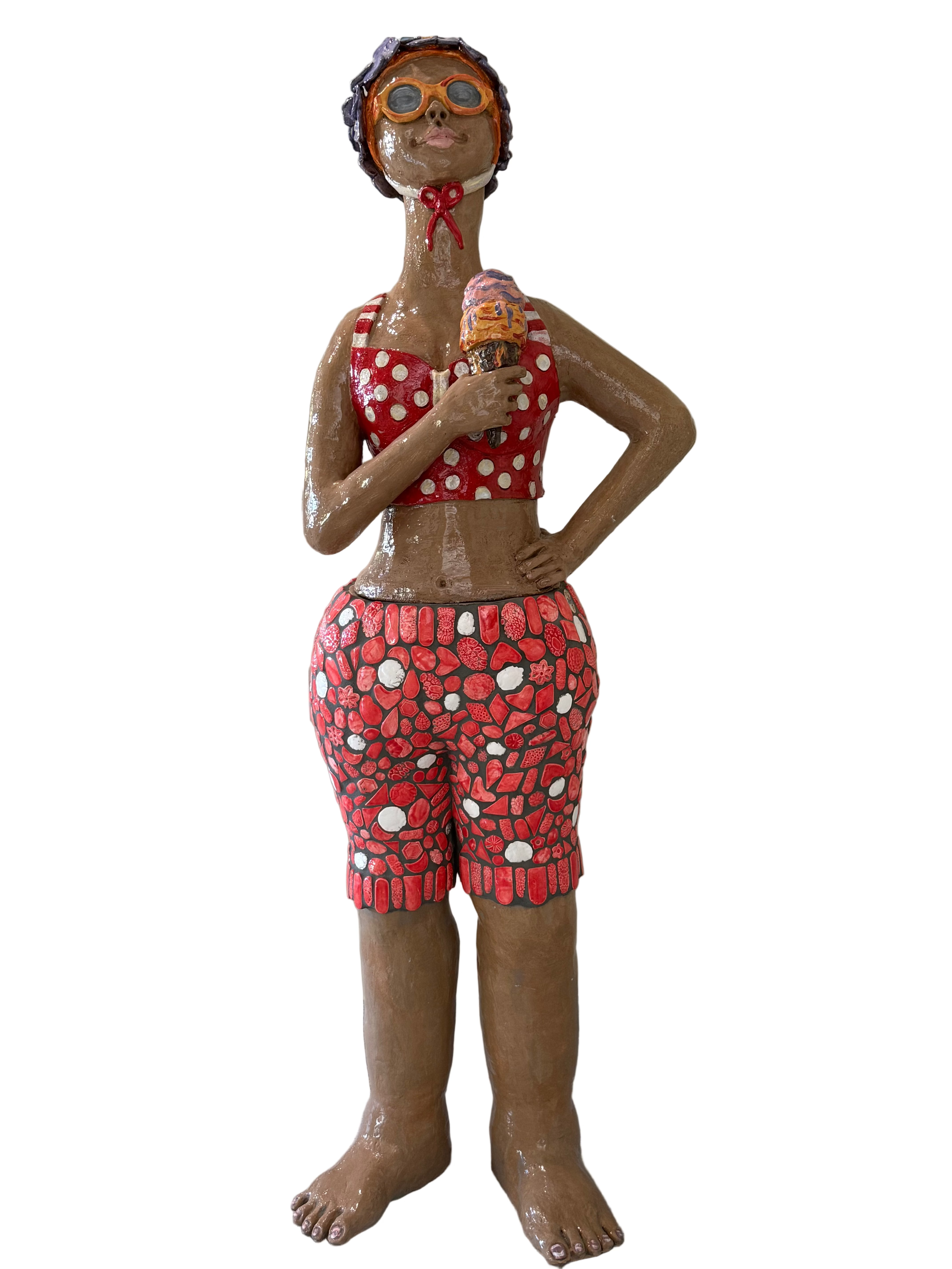 This gorgeous life-sized sculpture is made from BRT, painted with coloured slips and underglaze colours and adorned with embellishments and mosaic tiles..