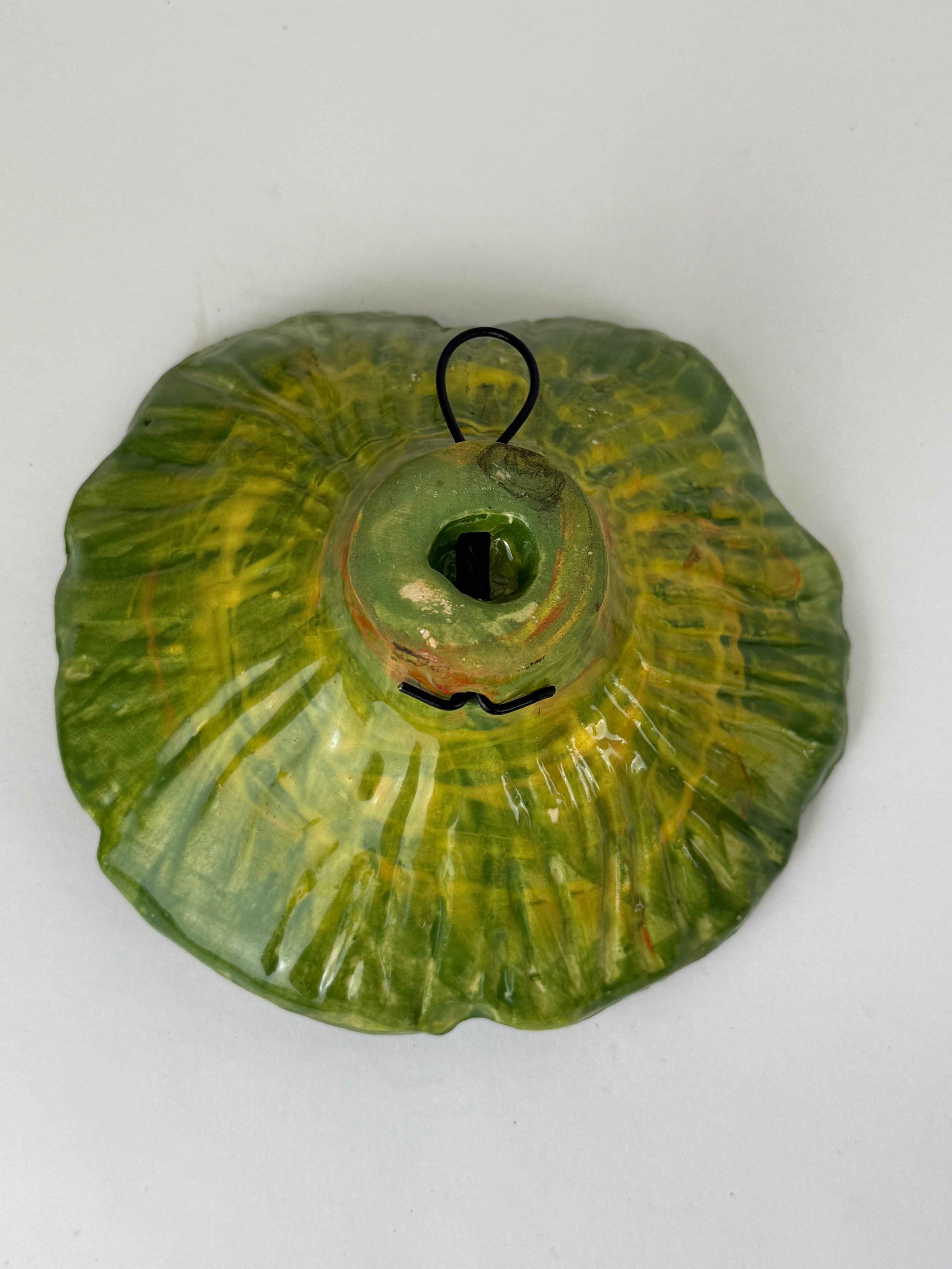 Hand Sculpted and wired hanging Wall Flower made from SWE and clay and glazed in Transparent Green Glaze.