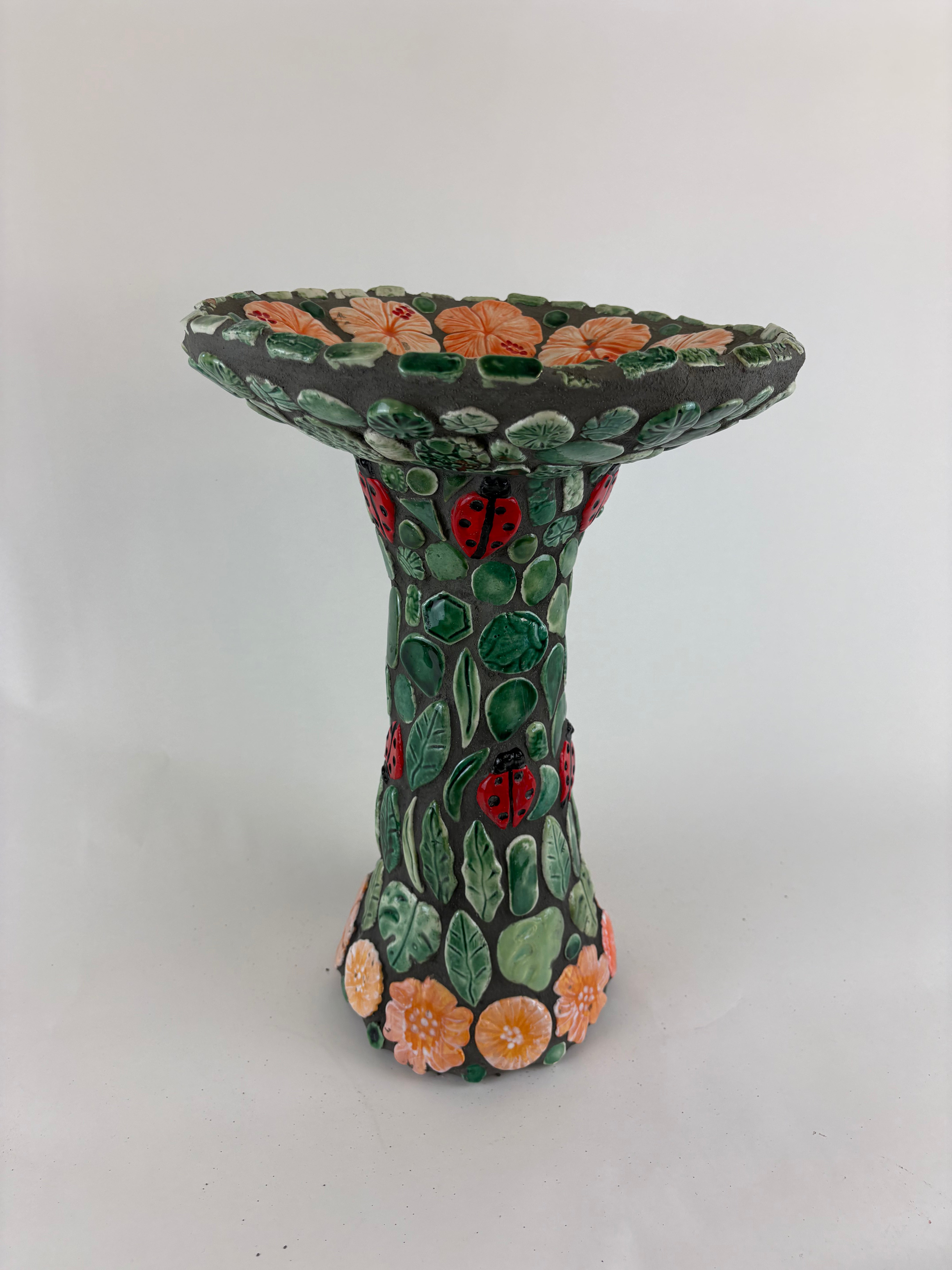 This bird bath is made from BRT, painted with coloured slips and adorned with embellishments and mosaicked, suitable for indoor or outdoor.