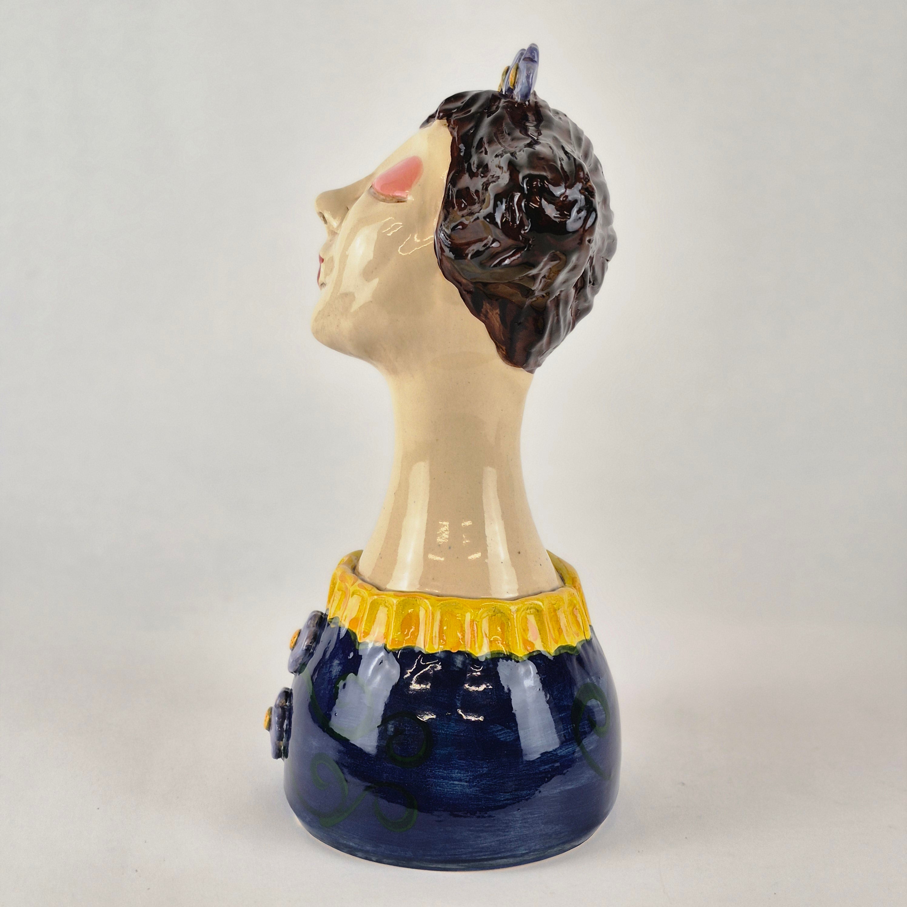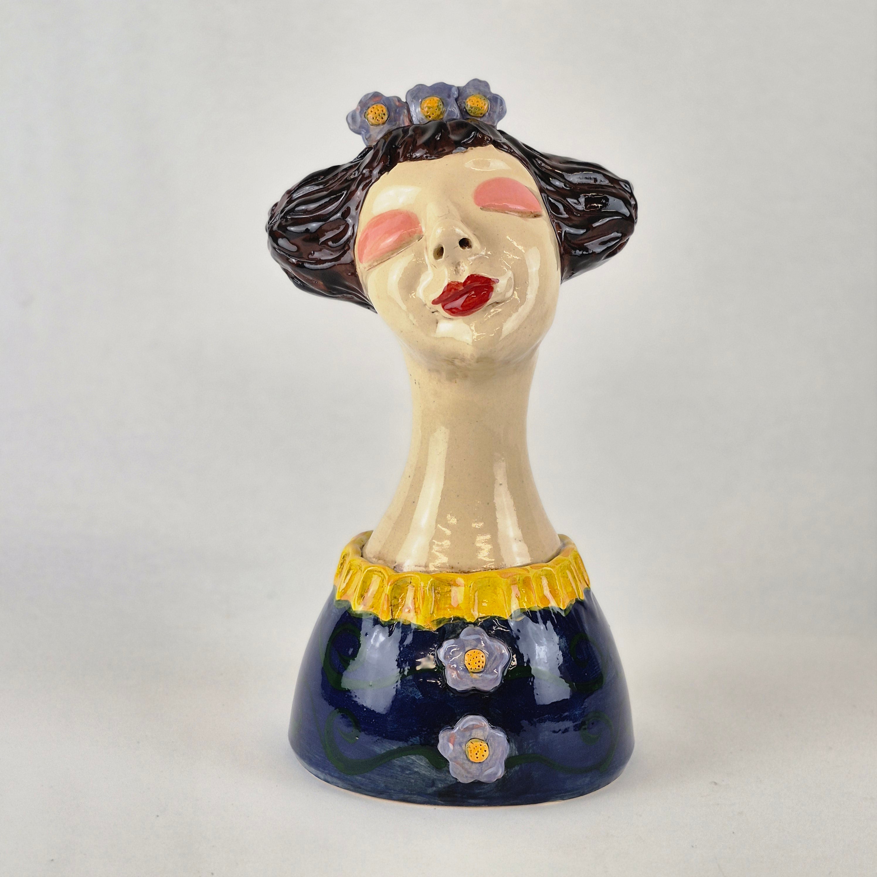 This bust is made from SWE, painted with coloured slips and underglaze colours and adorned with embellishments.