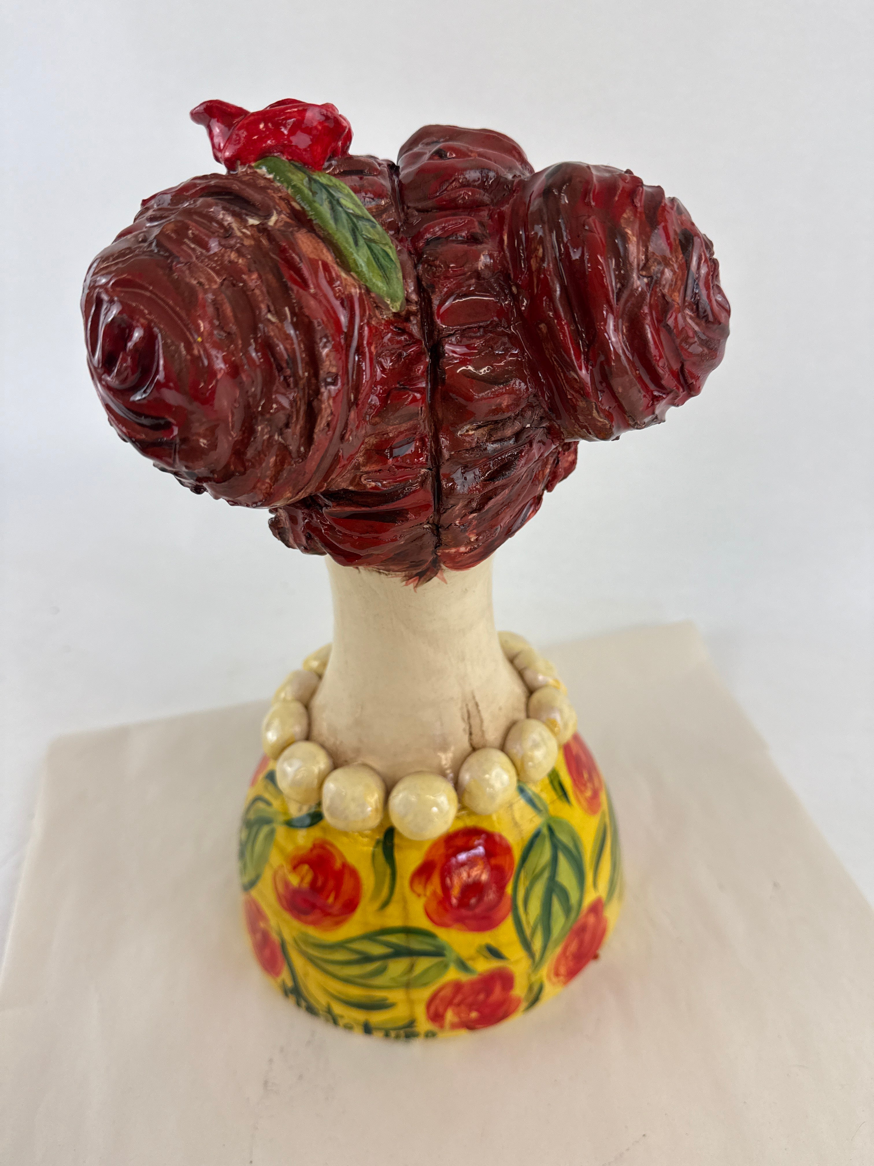 This bust is made from SWE, painted with coloured slips and underglaze colours and adorned with embellishments.