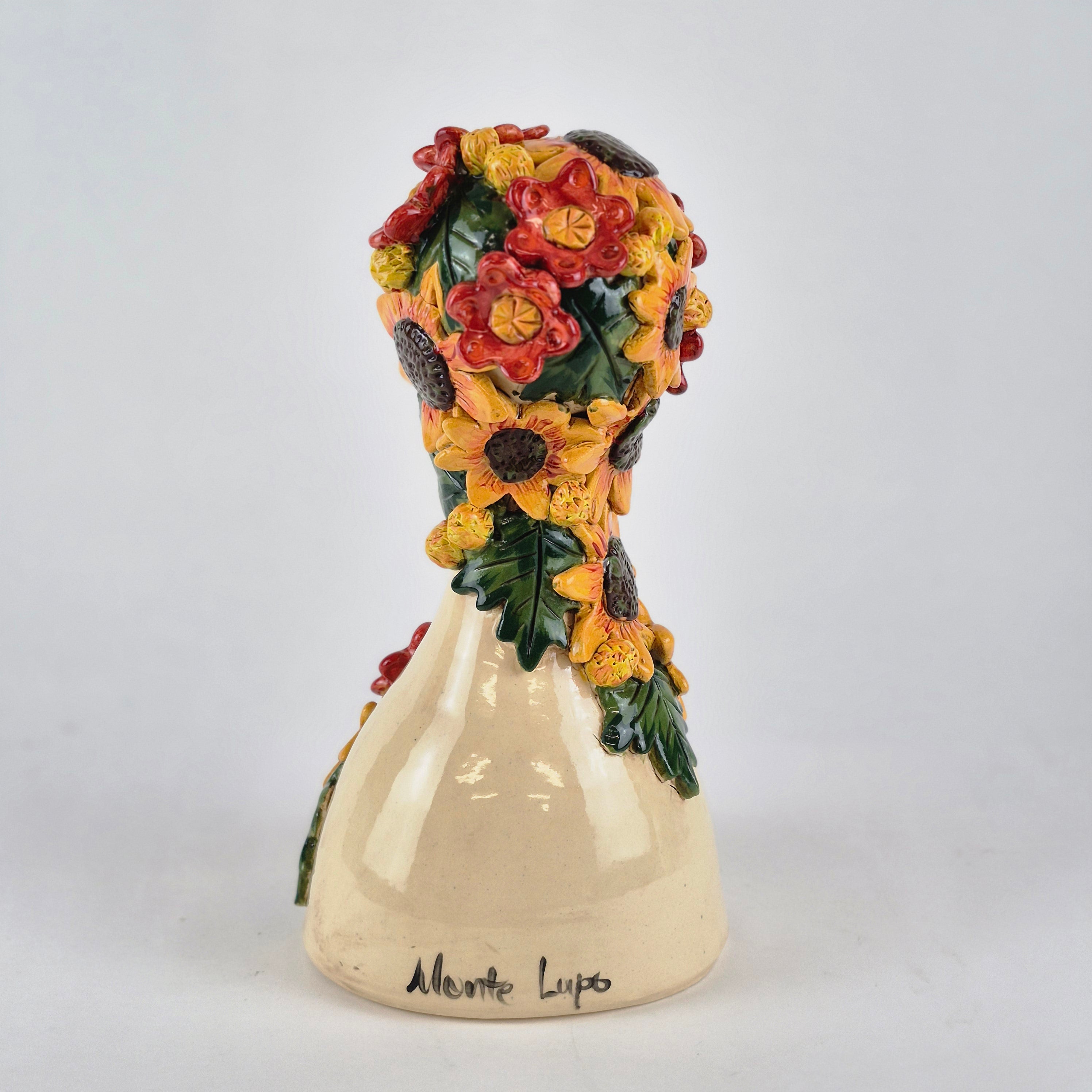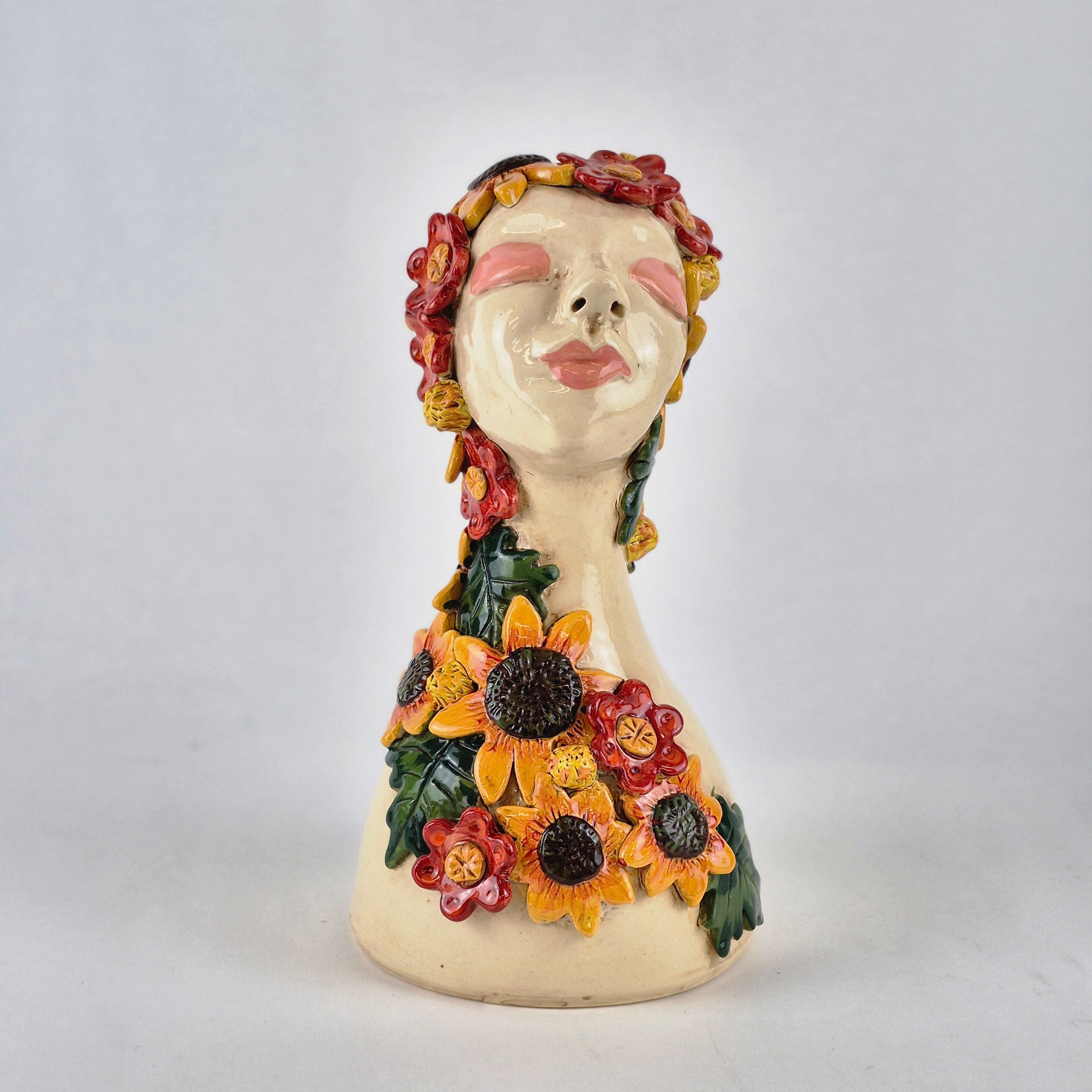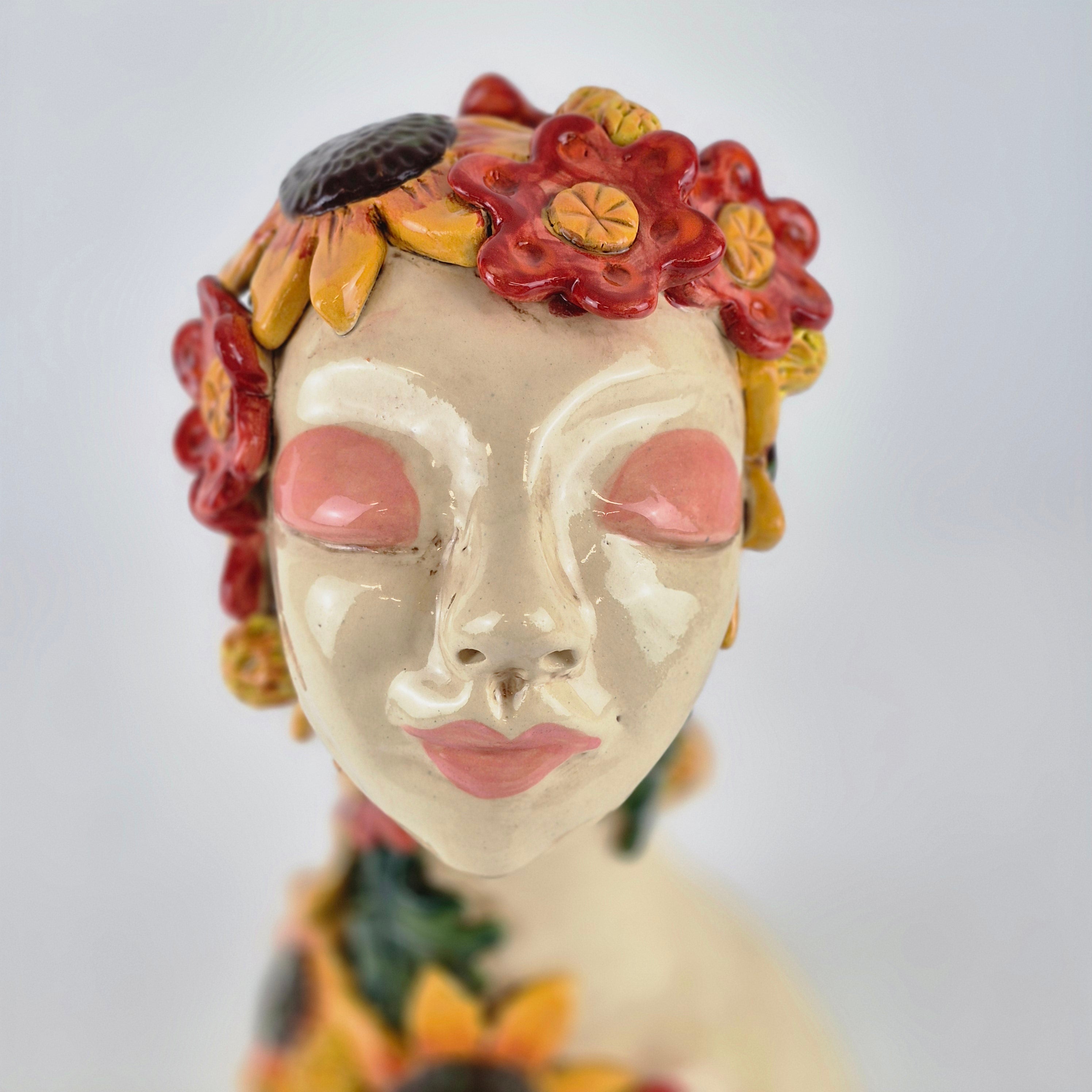 This bust is made from SWE, painted with coloured slips and underglaze colours and adorned with embellishments.