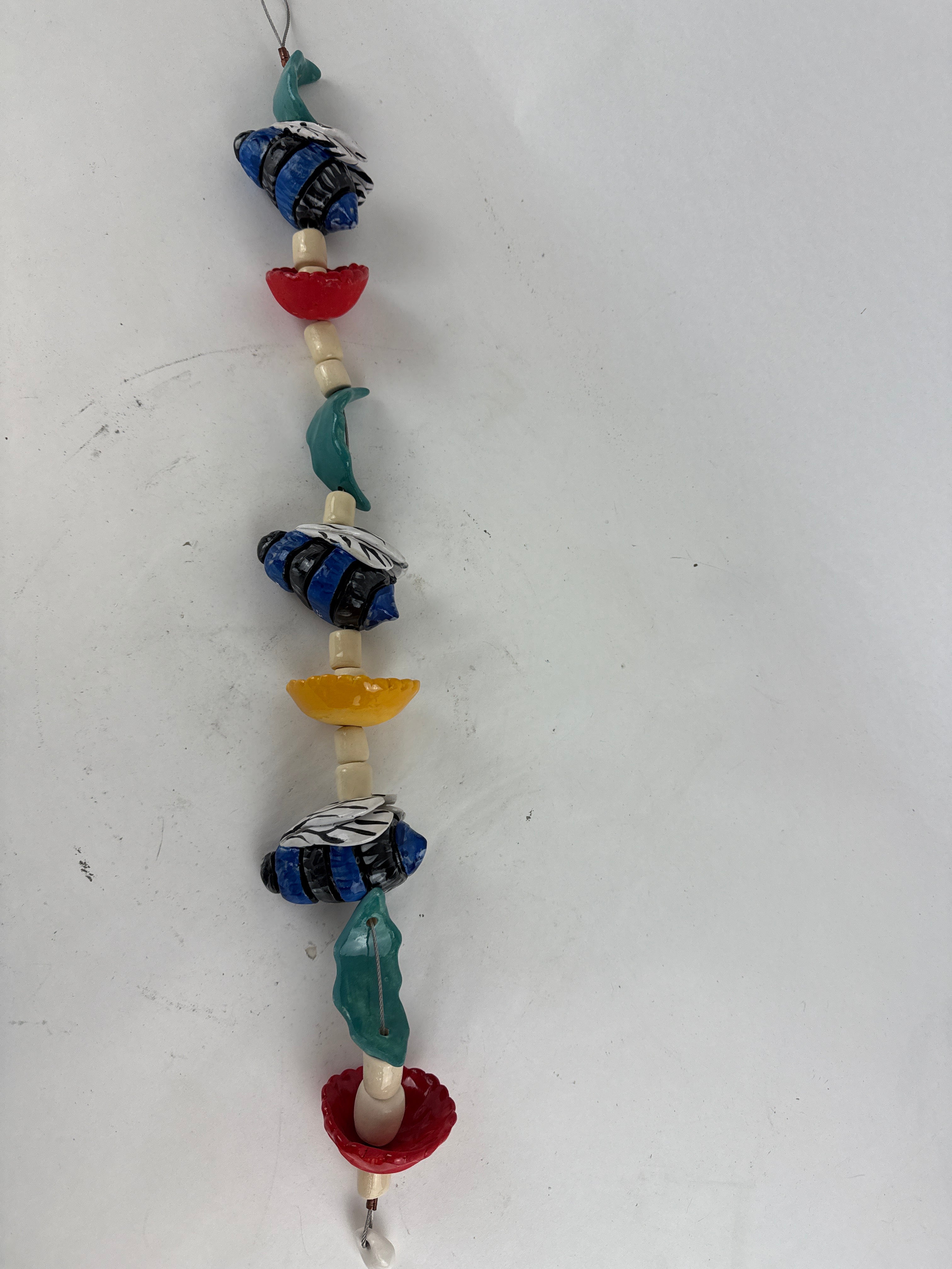 Hand carved, hand sculpted, and strung on a thick wire as a garden feature. Suitable for indoor and outdoor decor.