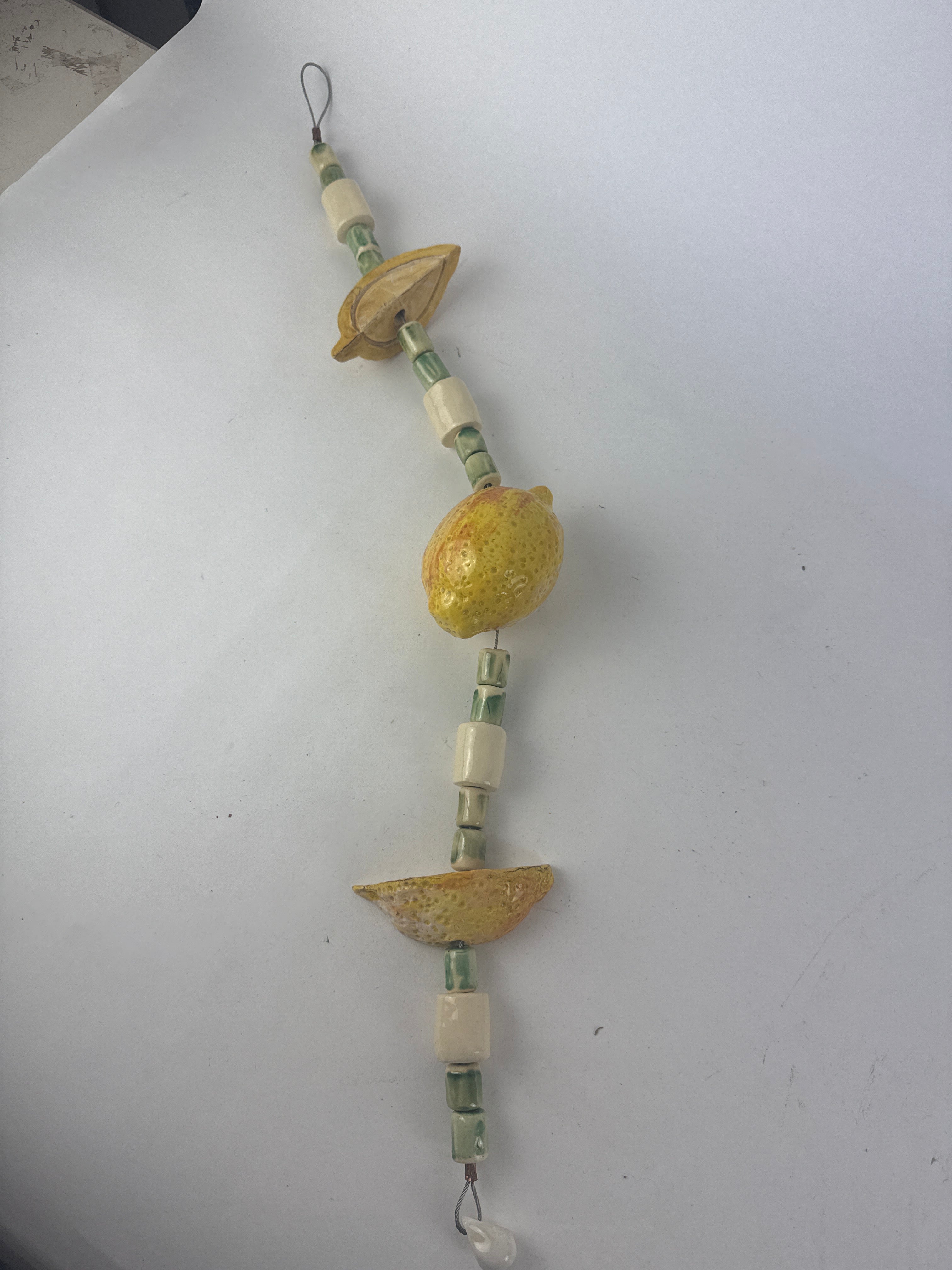 Hand carved, hand sculpted, and strung on a thick wire as a garden feature. Suitable for indoor and outdoor decor.