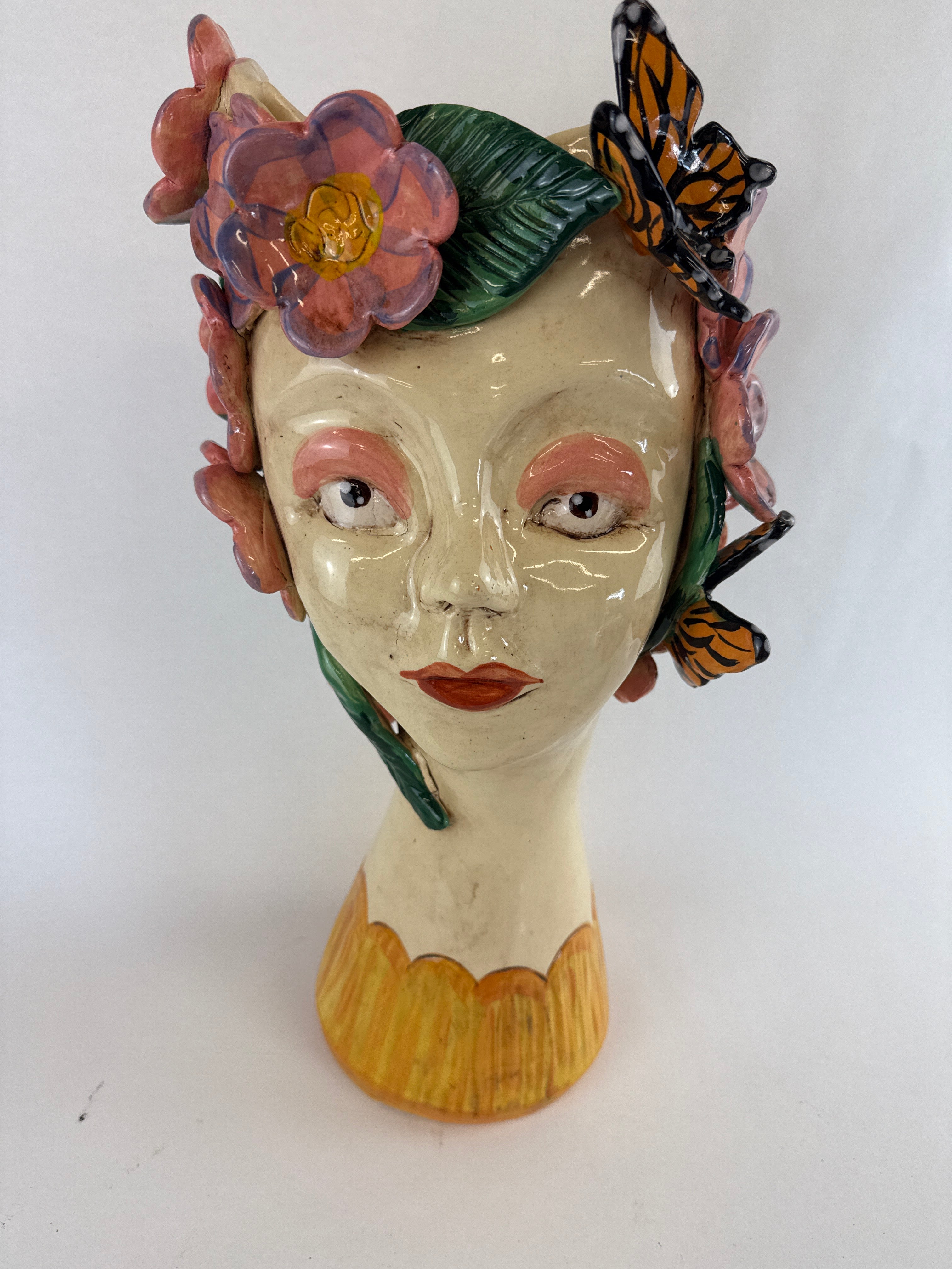 Ceramic head planter, hand painted and sculpted, suitable for indoor or outdoor use including drainage holes in the bottom of the planter.