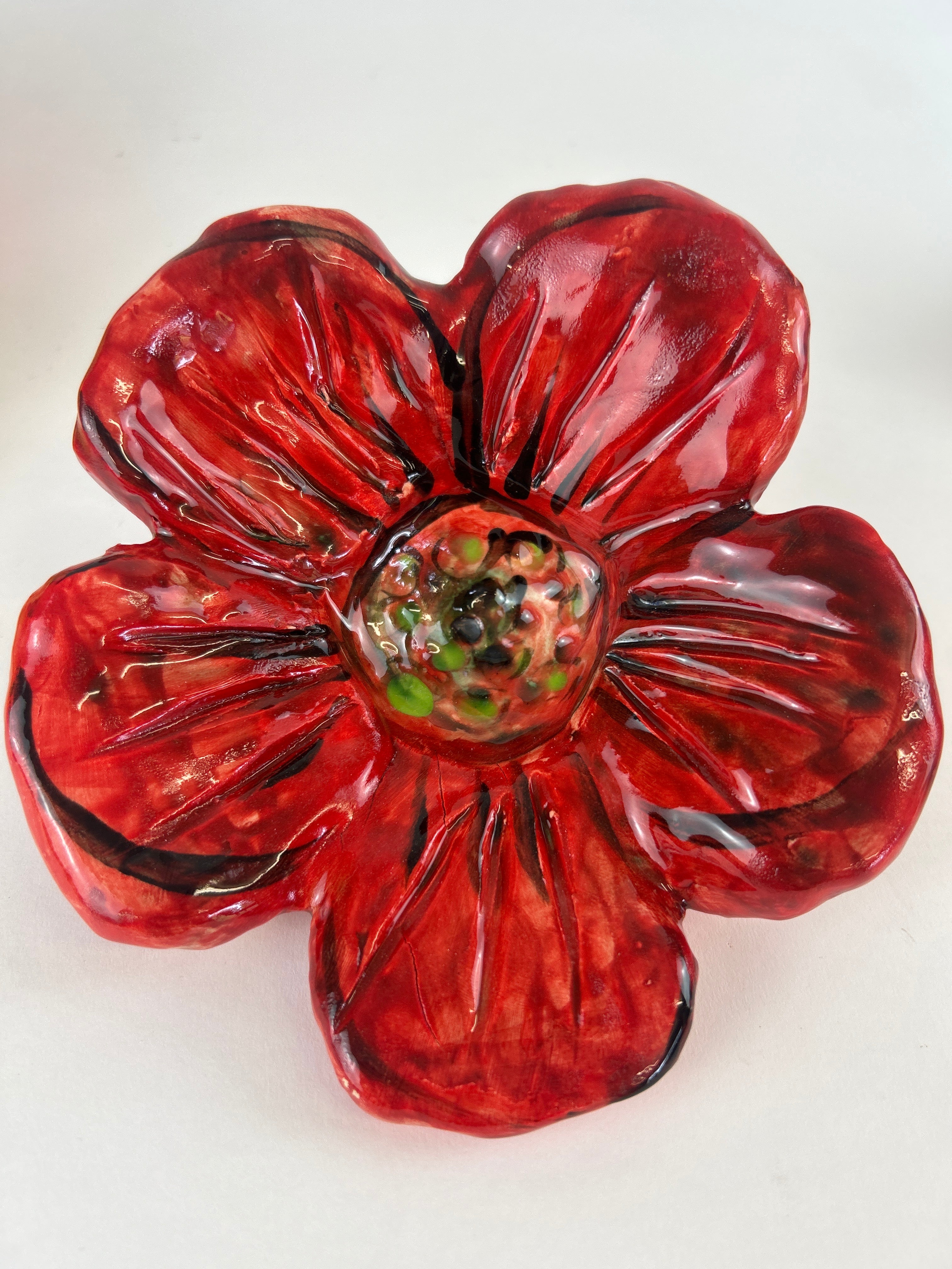 Hand Sculpted and wired hanging Wall Flower made from SWE and clay and glazed in Transparent Green Glaze.