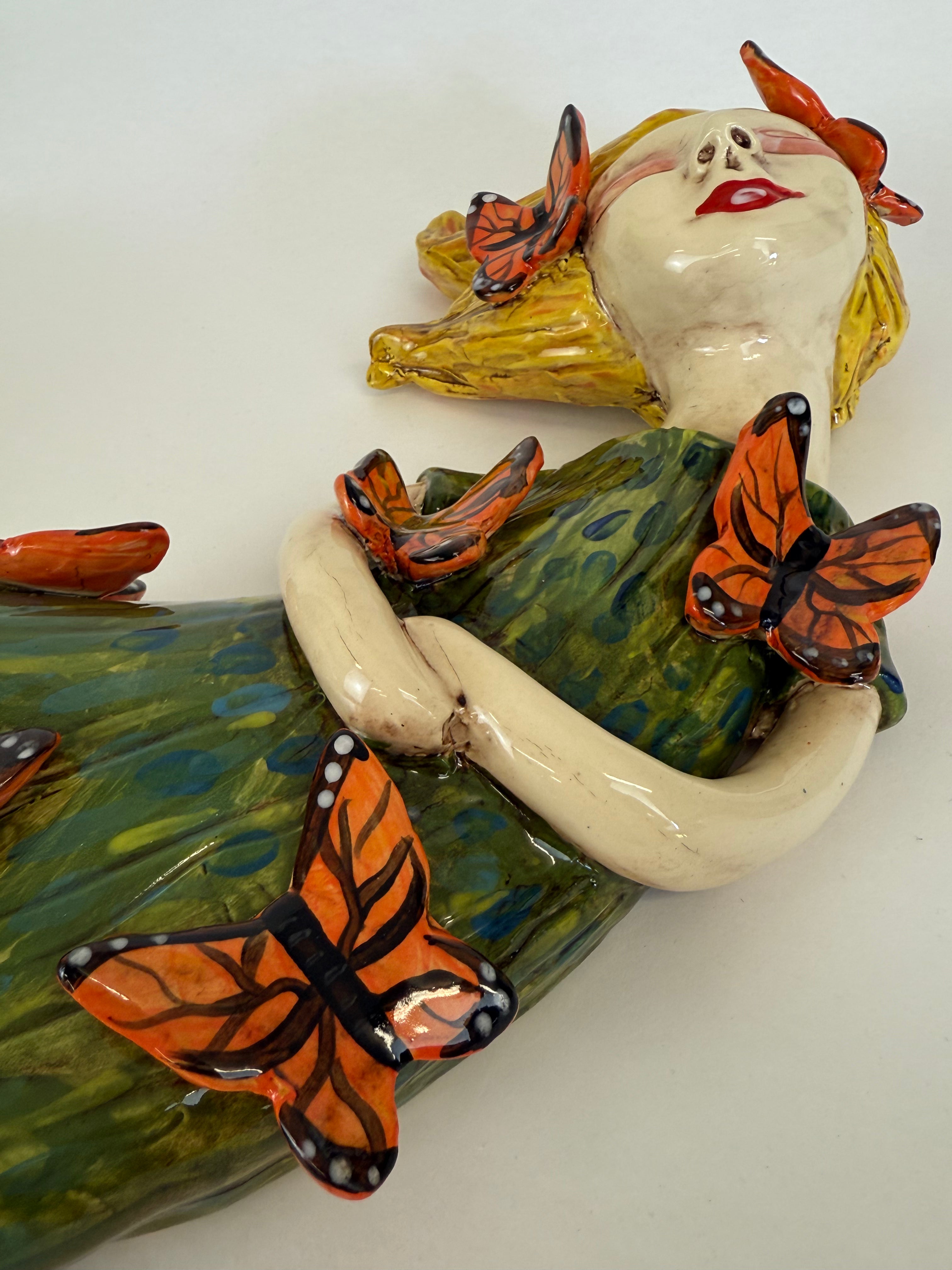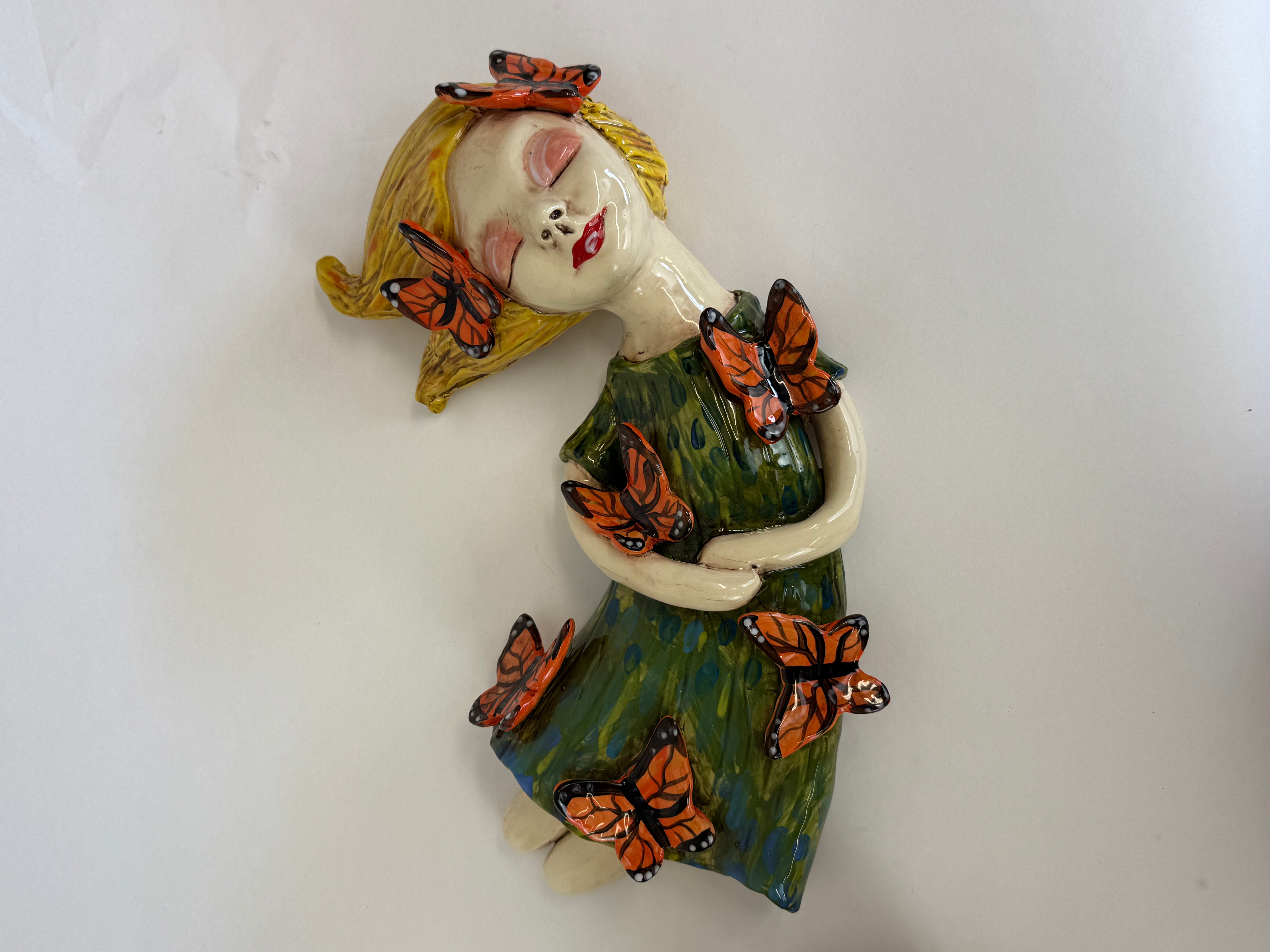 Hand sculpted and hand painted wall flying wall lady. Made to hang on your wall.