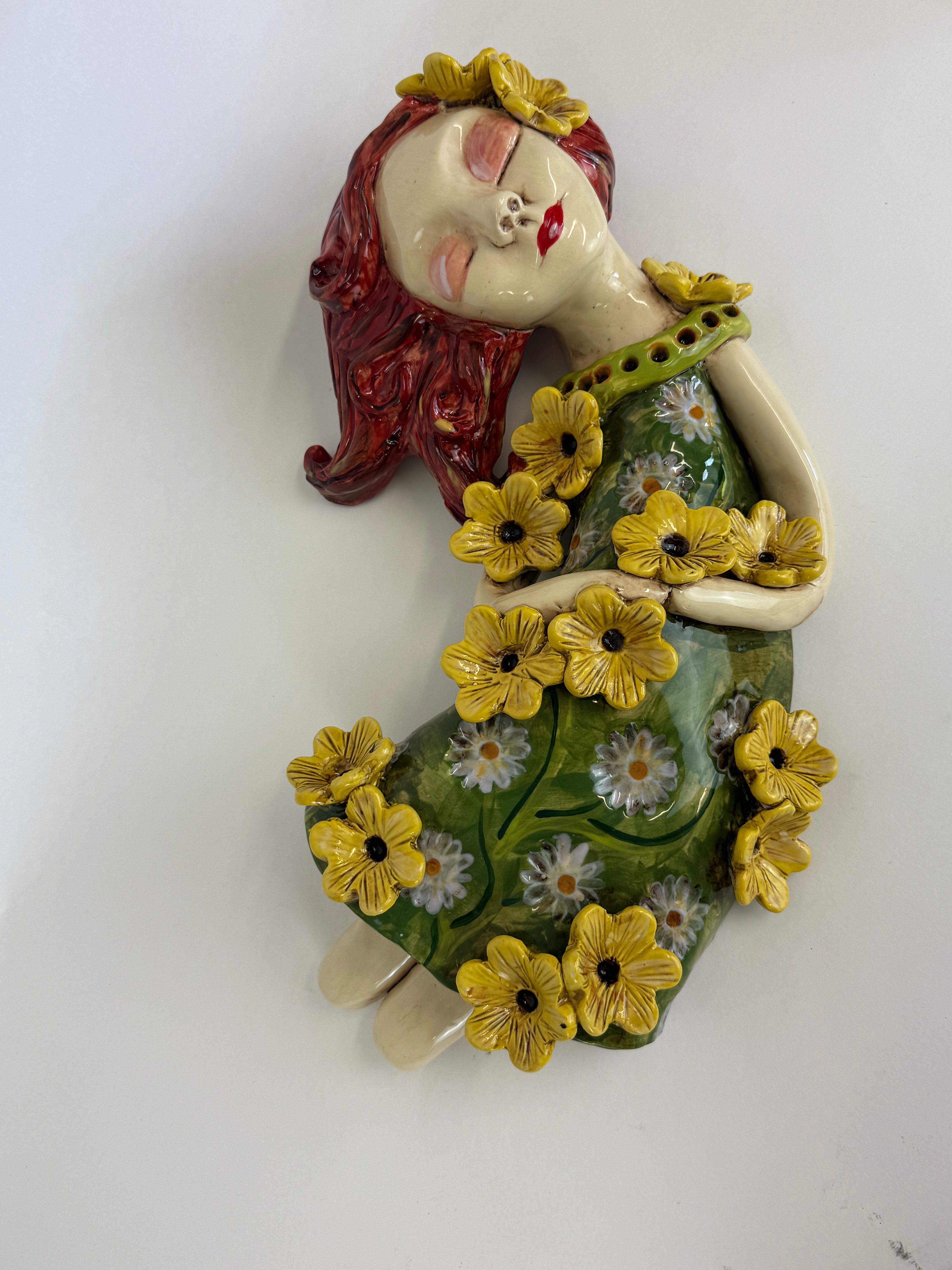 Hand sculpted and hand painted wall flying wall lady. Made to hang on your wall.
