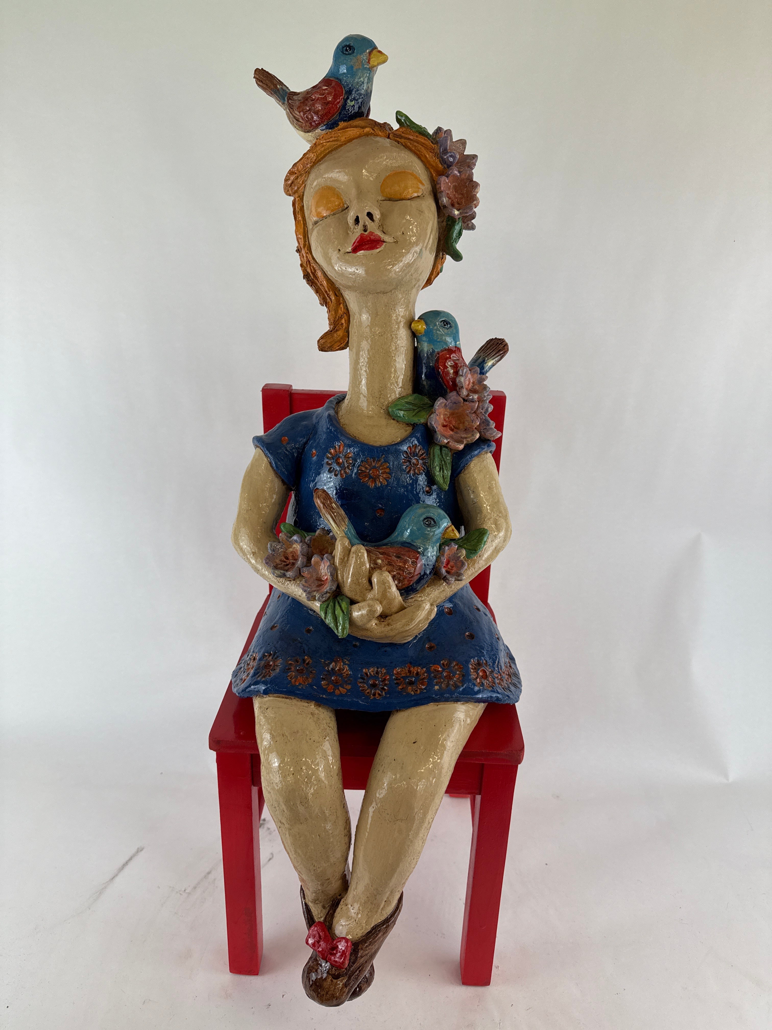 This large garden dweller is made from BRT, painted with coloured slips and underglaze colours and adorned with embellishments. Sitting on a wooden chair
